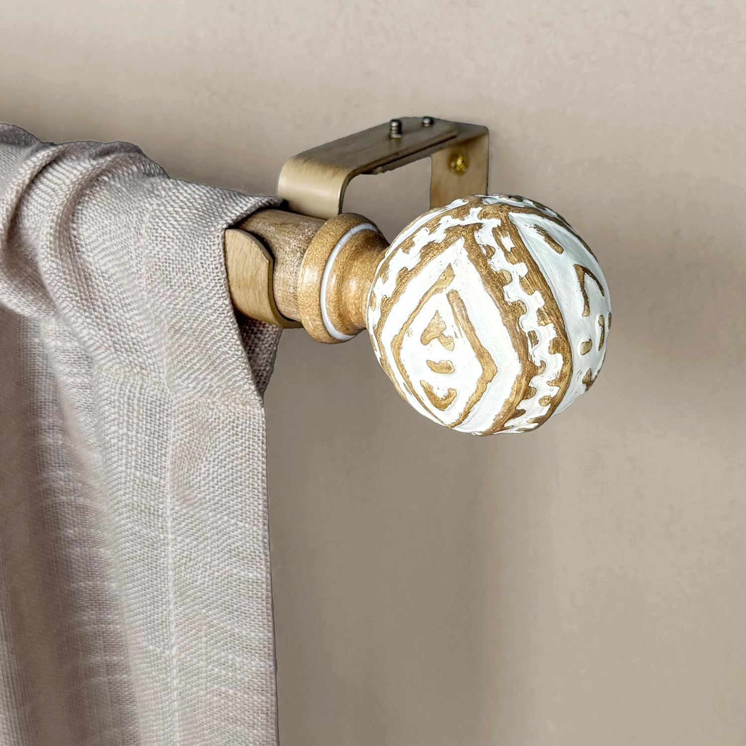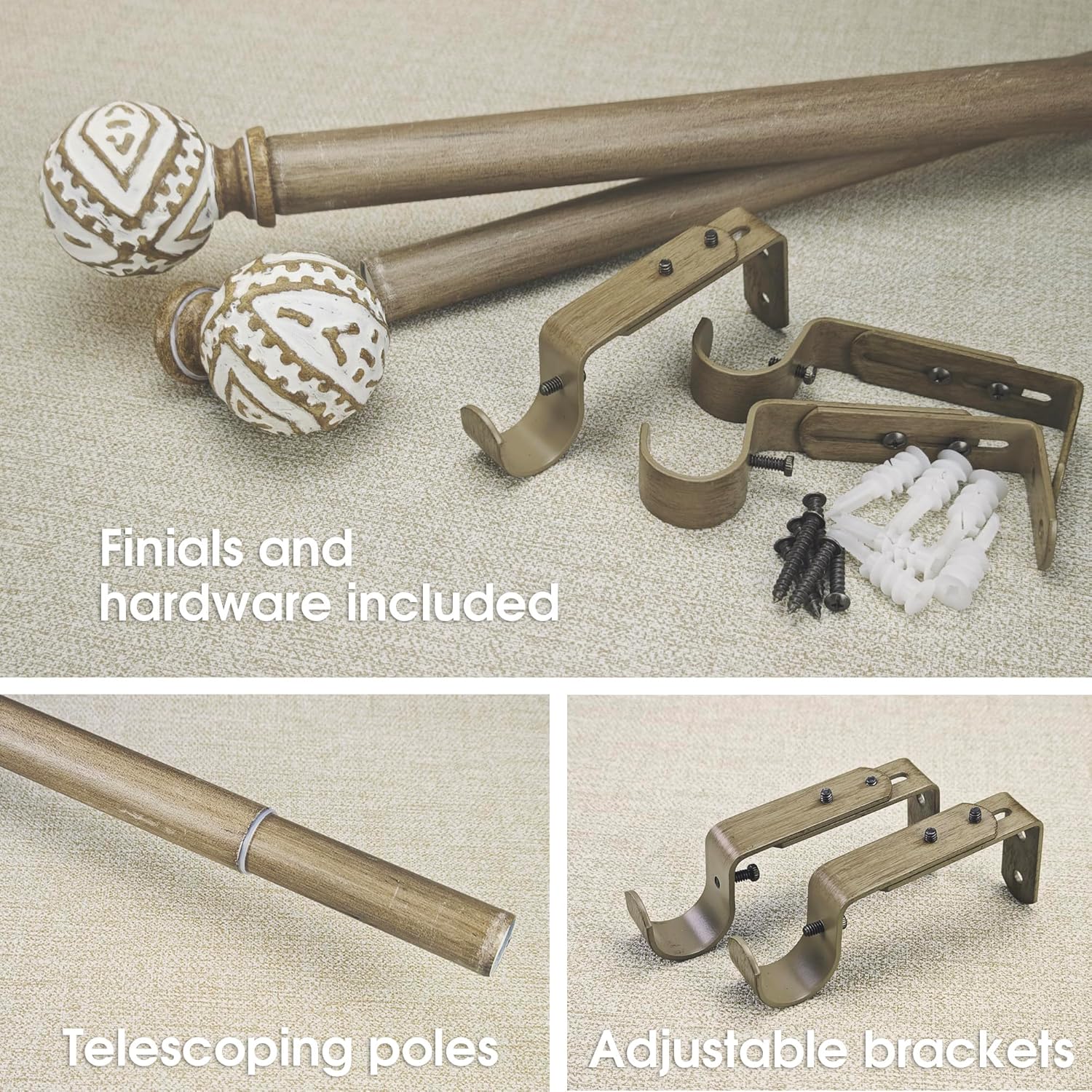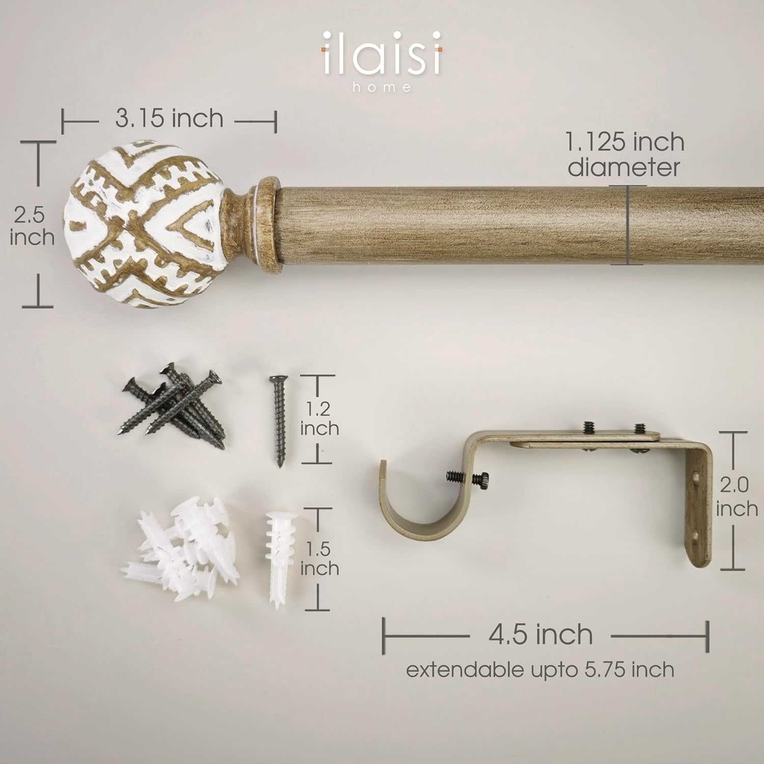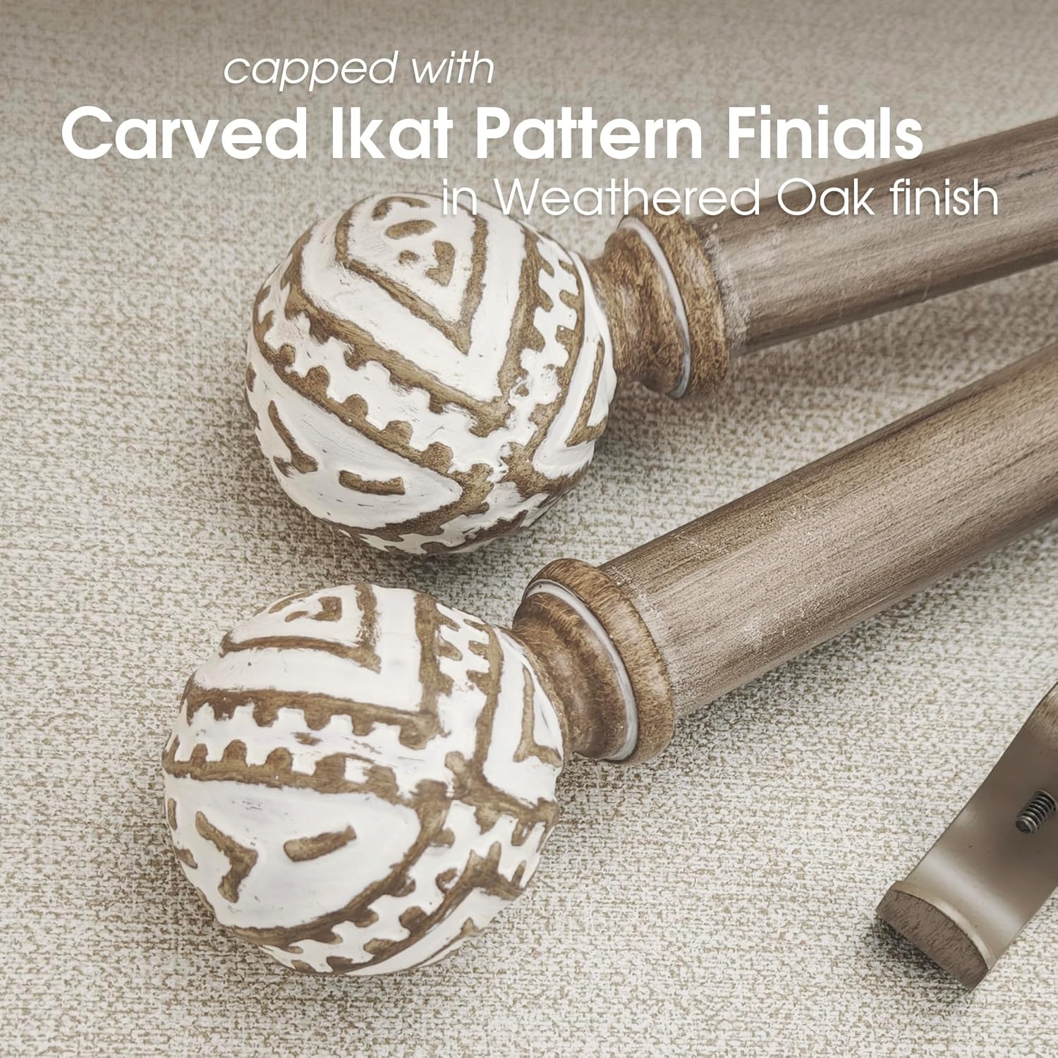 ILAISIHOME 1-1/8 Inch Diameter Weathered Oak Curtain Rods with Ikat Pattern Finial, Telescoping Single Curtain Rods