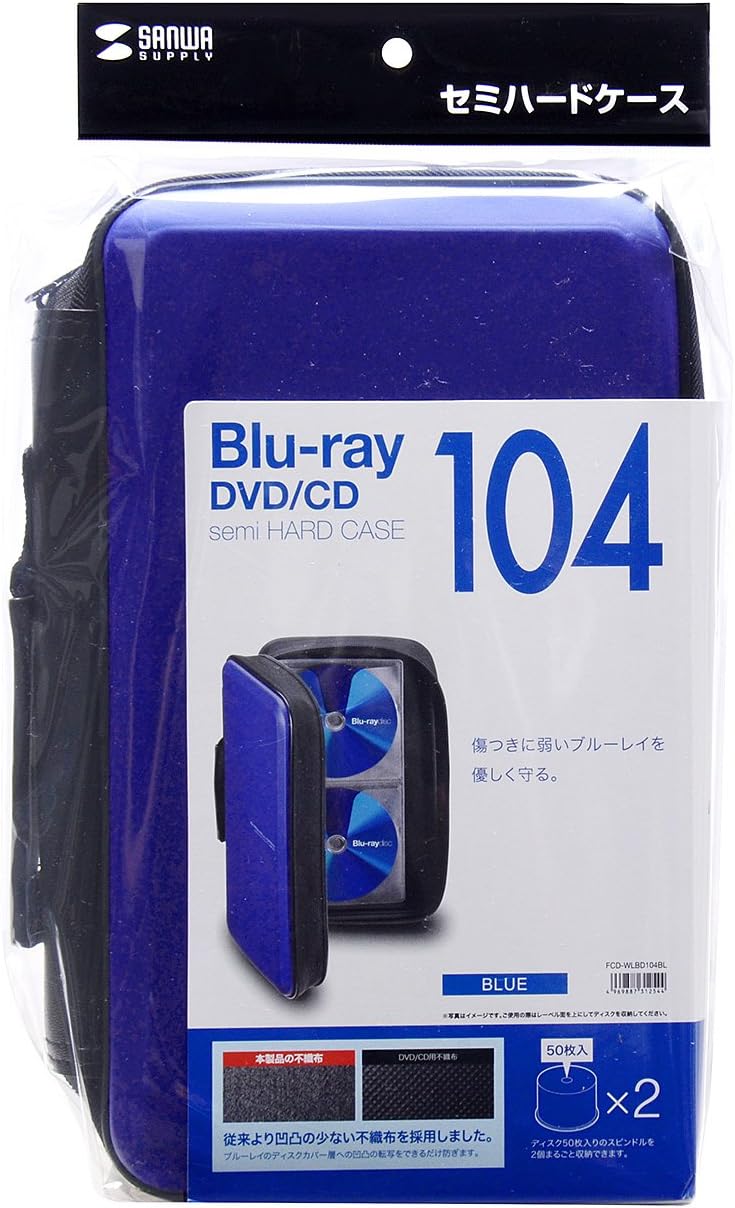 Semi-hard EVA case with soft non-woven fabric that is compatible with storage of Blu-ray discs. Made with soft non-woven fabric that is compatible with storage of Blu-ray discs. Prevents uneven transfer to the disc cover layer as much as possible. The case is made of EVA material semi-hard case to protect the media from impact. Zipper type for easy carrying. The non-woven fabric has notches for easy insertion and removal of discs and a side stopper to prevent them from jumping out. The contact surface of the disc has a textured surface with label ink that is difficult to stick. Holds all 2 spindles with 50 discs. Color: Blue. Capacity: Blu-ray, DVD, CD/104 sheets. Size (W x D x H): 7.1 x 3.6 x 11.8 inches (180 x 9Weight: 14.2 oz (420 g). 【Material】: Case: EVA (vinyl acetate), Side: PU (polyurethane) Non-woven fabric: PP (polypropylene)