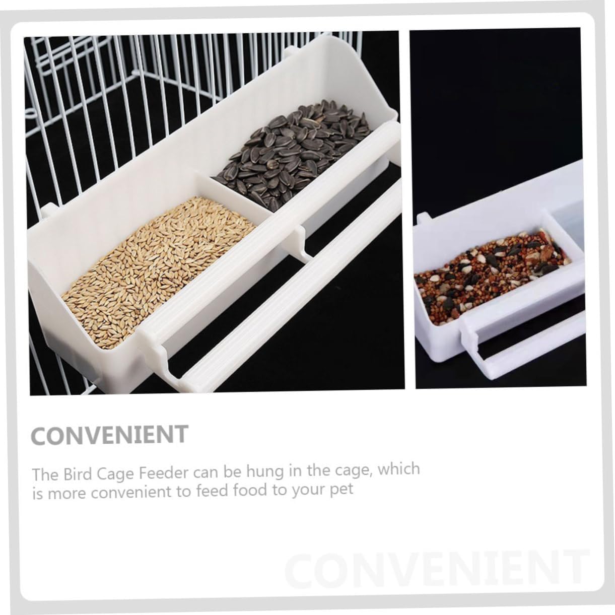 Package Include 12 Cage Feeders Features -Color:White practical bird feeder -Material:PP food container -Size:21.30X5.30X5.00cm/8.37X2.08X1 fruit container. - The Bird Cage Feeder can be hung in the cage, which is more convenient to feed food to your pet parrot feeding container. - The hanging bird feeder is easy to place and , clip design, and convenient and easy to install it small plastic containers. - Multifunctional and versatile, can be used for most pets, such as rabbits, , parrots, hamsters, etc tray. - High-grade and practical plastic material and fine craftsmanship, it's very strong and sturdy bird food holder. - Large capacity design, you can put a lot of food if or work parakeet bird cage.Goods Informationbird feeding cup If you've been looking for a pet bird feeding bowl, then your search is over! That's because our pet bird feeder bowl will meet your needs.bird cage feed container The Bird Cage Feeder can keep your pet food in an orderly manner without waste.double girds bird feeder Made of high-grade and wear- material, it is sturdy and durable