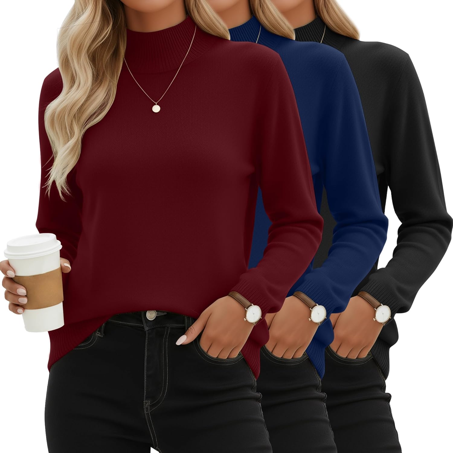 Features: Size selection: Please check our size chart before you place order for comfortable wearing. Clothing maintenance: Machine washable or hand wash with cold water. Do not bleach / lay flat to dry / do not iron at high temperature. Material: 49% Viscose, 23% Nylon, 28% Polyester Package includes: 3 x Women's mock turtleneck knit sweaters Notes: Manual measurement, please allow slight errors on size. The color may exist a slight difference due to different screen displays