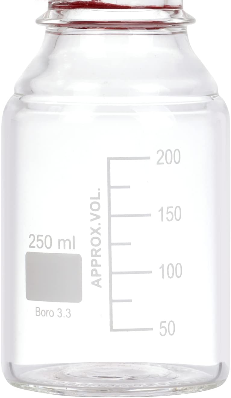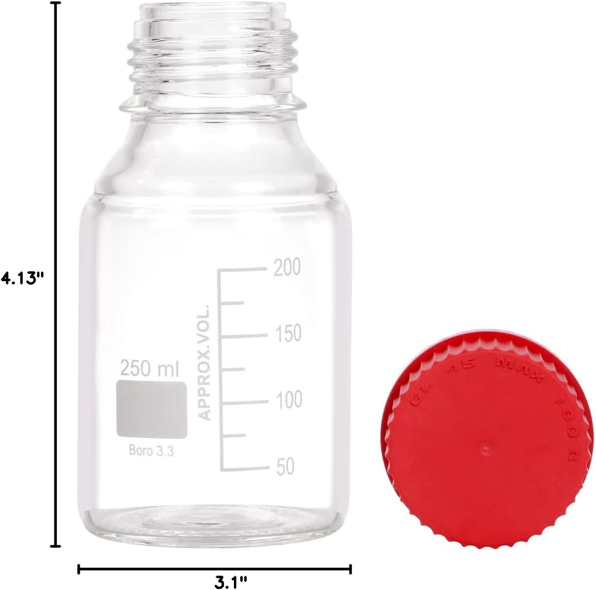 · Durable Thickened Borosilicate Glass: these jars are 100% of clear smooth borosilicate glass and feature with fire and water resistance, thermal stability, alkali and acid resistance · Autoclavable: the reagent bottles can be used with up to 360°C, reusable, environment friendly, transparent thick even glass, can be used for long-term storage as well as mixing and sampling · GL45 PBT Red Screw Caps: the caps are made of Polybutylene Terephthalate, can be used up to +180°C, better than normal PP caps, tight seal with drip free pouring rings, leak-proof · Capacity: 250ml/8.5oz, permanent white enamel graduations from 50ml o 200ml, accurate scales, easy labeling; Dimension: OD: 2.56", Neck ID: 1.77", Height: 5.5"; Package includes 4 pieces storage glass bottles with caps · Widely Used: these ideal lab glass bottles fit for storing chemicals, liquids, powders, biologicals and other liquid solutions for lab, experiment, chemistry, scientific studies and household home storage uses