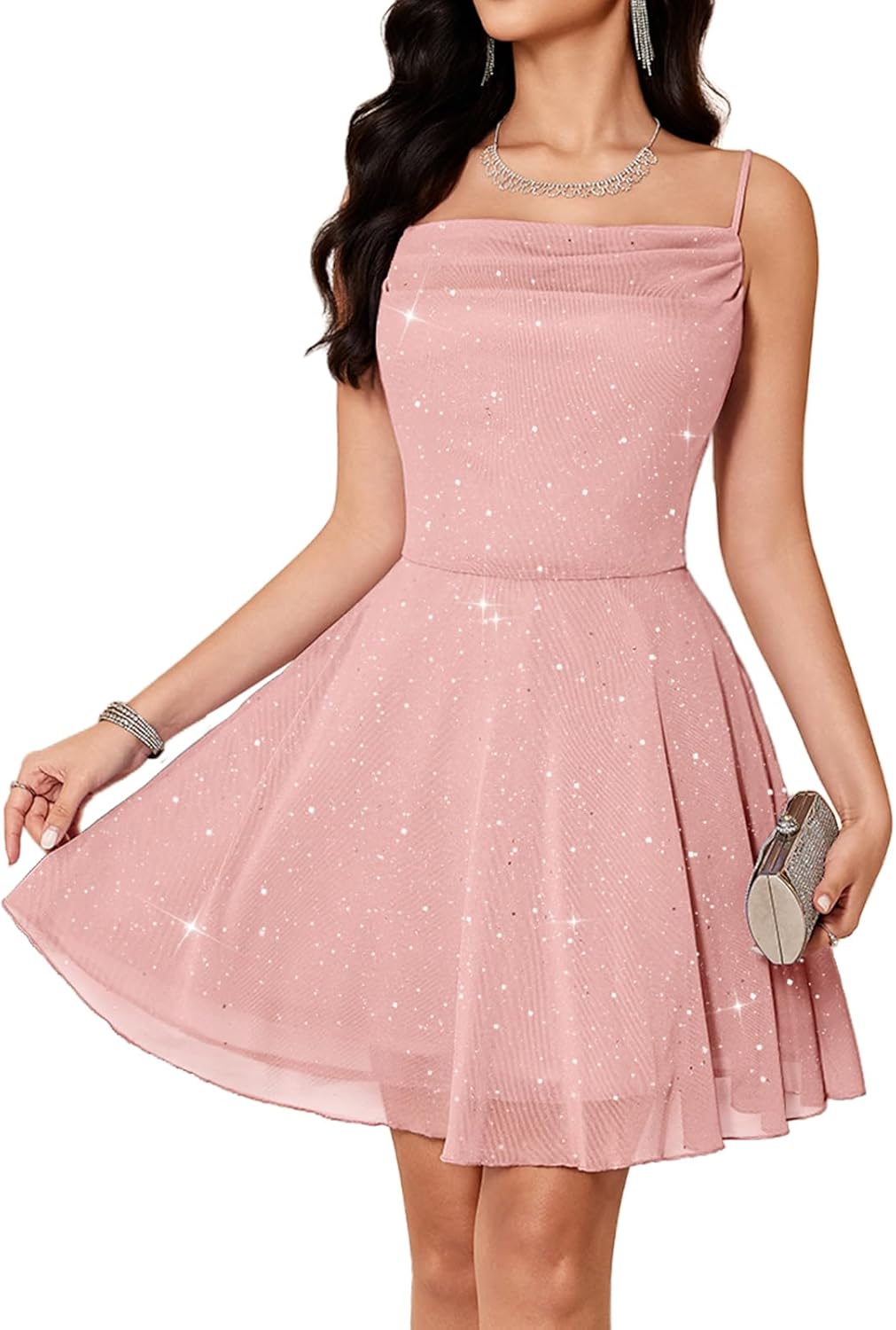 Picture this: You slip into this dress and instantly feel the difference. The airy, flowy fabric moves with you, light as a whisper. It’s not just sparkly—it’s covered in micro-sequins that catch the light without shedding a single speck, so you shimmer from dinner to dance floor without a trace behind. The spaghetti straps and soft cowl neck frame you perfectly, creating that “stunning” silhouette reviewers rave about. Then there’s the skirt—a flirty A-line with a delicate ruffle hem that swings with every step. Hidden inside, a lightweight layer gives it that perfect “flawless shape without looking poofy,” just like a reviewer described. This is your go-to dress for those “where do I look?” moments: your senior prom, a best friend’s wedding, homecoming, or a fancy date night. It’s the dress you feel confident in, the one that gets you stopped for compliments. For your perfect fit, always check our size chart. Now, go own your spotlight.
