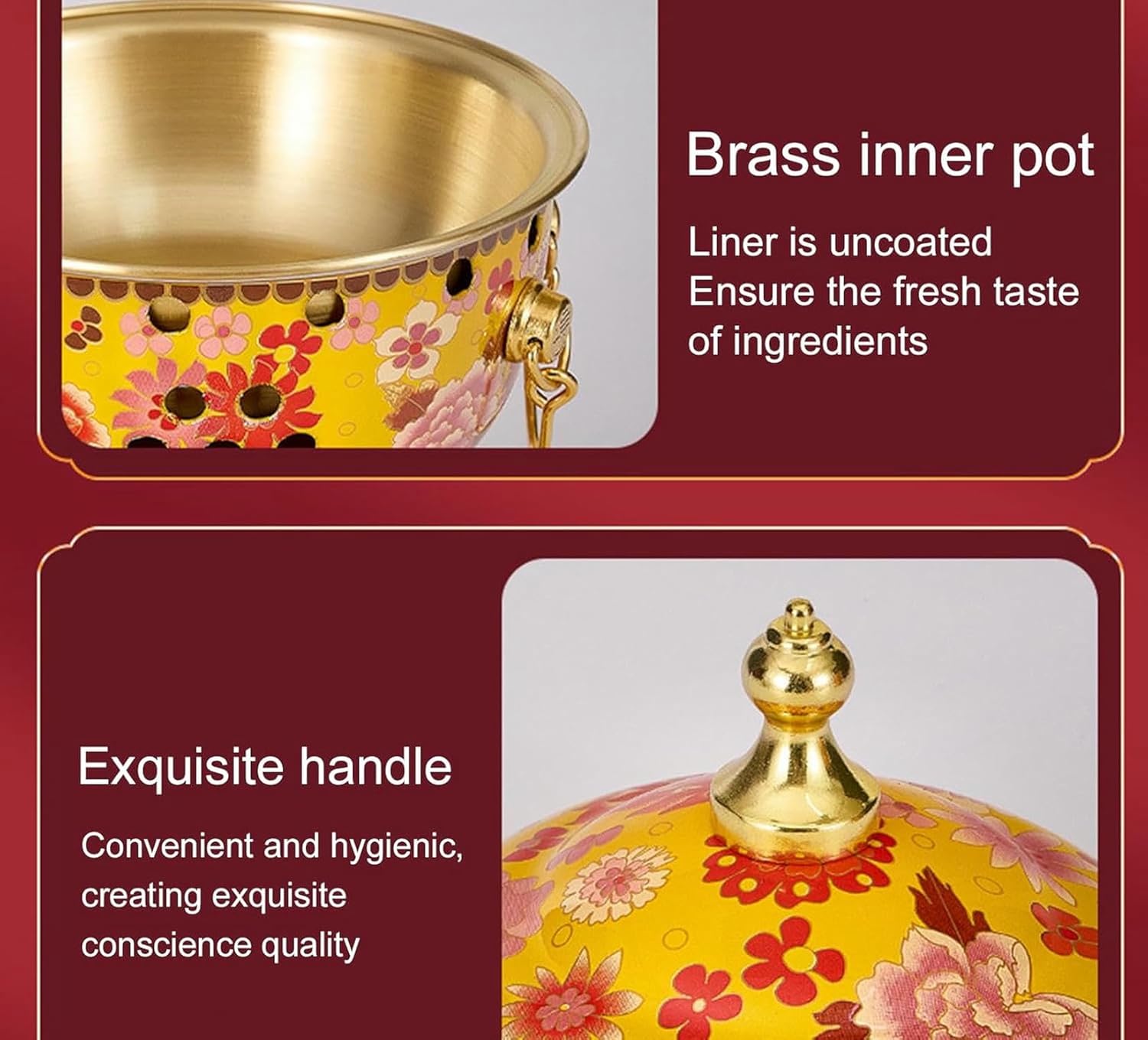 Product description★ About the traditional Chinese hot pot:It is called the hot hot pot of Beijing or Chinese hot pot.This is the traditional culture and art of China.It can be seen among the Chinese.The lower part of the traditional hot pot is burned with coal and heats up the original flavor of the food.Now enjoy the traditional Chinese flavor with your family and friends.★ Product name: Cloisonne enamel individual alcohol pot★ Fuel: alcohol.★ Features: pure copper, fast, comfortable and hygienic warming.★ Material: enamel + pure copper lining.Uses:1. Wash the hot pot, add a small amount of water, approximately one third and cover it.(The first part of the water is to prevent it from drying out. If it dries and burns, it will cause leaks directly at the bottom).2. Add burning coal to the fireplace.3. Add some water to the lower plate and place the hot pot on the plate to avoid damage to the table.4. After dinner, remember to turn off the fire.Security warningMer away from naked flames or direct heat sources.Check the manual for more details.