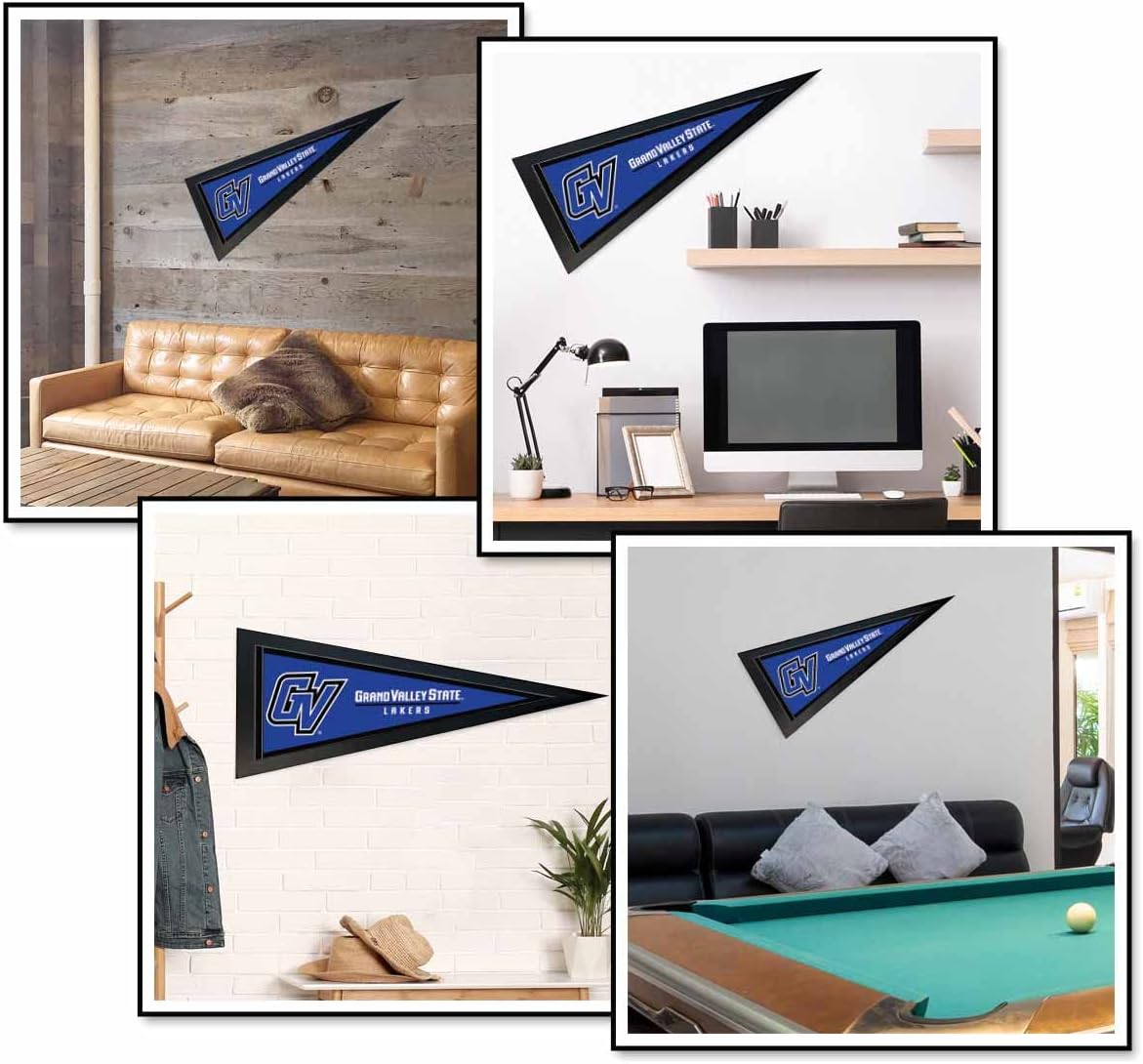 GVSU Lakers Pennant and Wood Pennant Frame includes a 12x30 inch soft poly felt Officially Licensed pennant and the recommended Pennant Frame which is made of solid poplar wood.The pennant is full size, single sided screen printed, and is ideal to display on any wall of your home, office, gameroom, or as a banner. The Pennant Frame is 13.25 x 34.25 inches, made of poplar wood moulding, stained black satin, includes a plexiglass front, and fits this pennant perfectly. Please Note: The pennant frame has a protective plastic film on both sides of the plexiglass. Please peel off from both sides when ready to use.