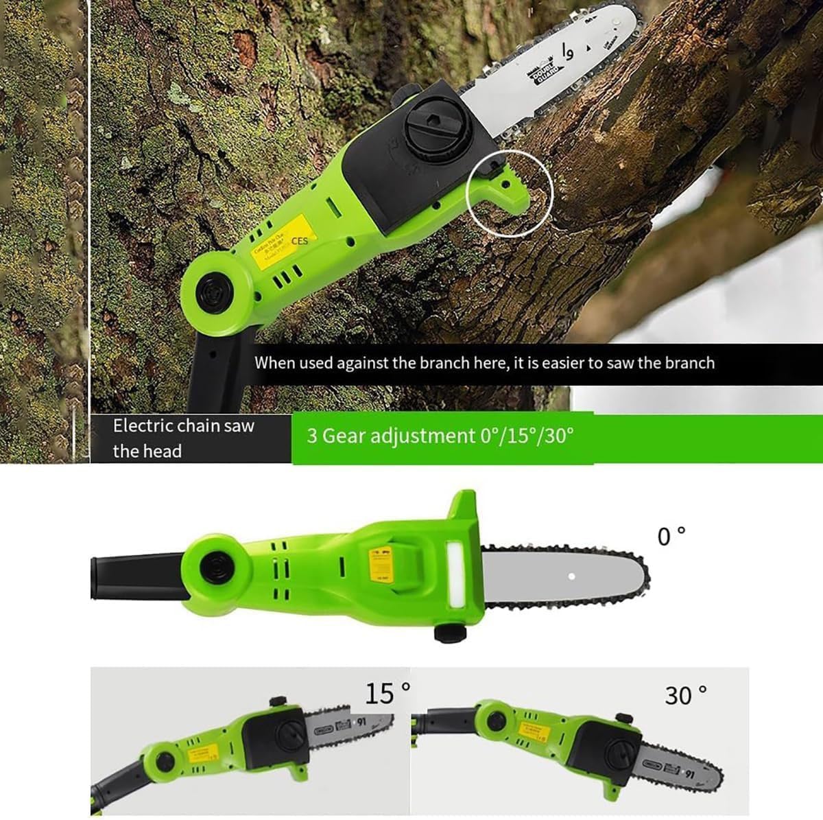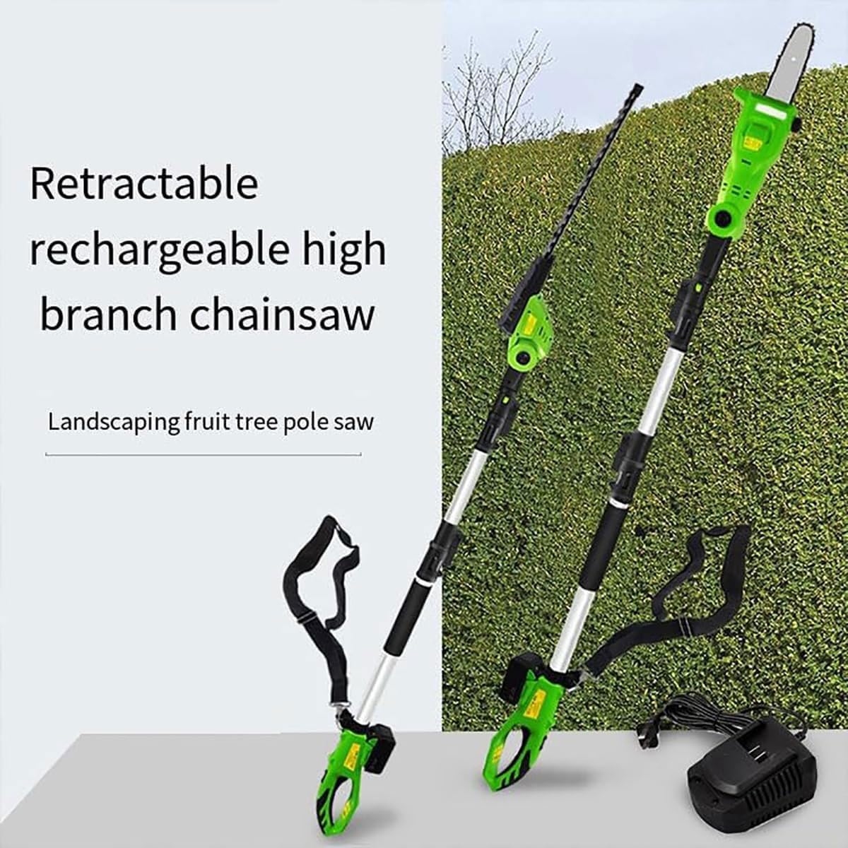 This versatile tool combines the functionality of a pole saw for trimming tree branches with a regular chainsaw for ground-level projects. Its detachable cutter bar enhances portability and storage convenience, while the adjustable cutter head allows for angle adjustments with a simple two-finger button press. Safety is ensured with a built-in intelligent protection board.Specification:Name: 2-IN-1 Electric High Branch SawMaterial: Manganese SteelHigh Branch Shears No-load Speed: 1400/minHigh Branch Saw No-load Speed: 5.5m/sBlade Length of High Branch Shears: 450mmHigh Branch Saw Blade Length: 8 inchesNoise Value: 99dBTelescopic Length: High Branch Shears: 191-245cmHigh Branch Saw Telescopic Length: 166-220cmCharging/Life Time: 4000mAh/3-4 hours of charging provides 50-80 minutes of battery lifePackage Included:1 x High Branch Saw1 x Trimmer1 x Extension rod1 x Battery1 x Charger1 x User ManualNotes:1. Due to manual measurement, 2-3cm deviation is allowed.2. Different monitors have different calls, and the product color is subject to the actual product.