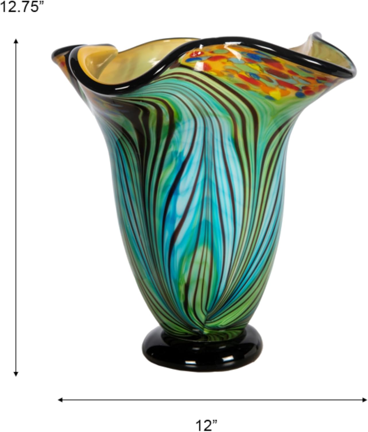 The cool, soothing tones of our Kalima Art Vase will add a gentle touch of color to any decor in your home. The generously sized vase begins with a background of crisp white Favrile Art Glass. An abstract leaf pattern in tranquil shades of blue green runs around Kalima’s circumference. Stylized flowers in complementary blues and greens on a bright yellow background are tucked between each leaf. The interior wall is colored in matching yellow, which provides excellent continuity. The wide ruffled mouth and round pedestal are black, which balances and defines the vase’s line. A pretty way to display a grouping of your favorite blossoms, our Kalima Art Vase makes an artistic statement when displayed on its own at the center of any table or shelf in your home or office.