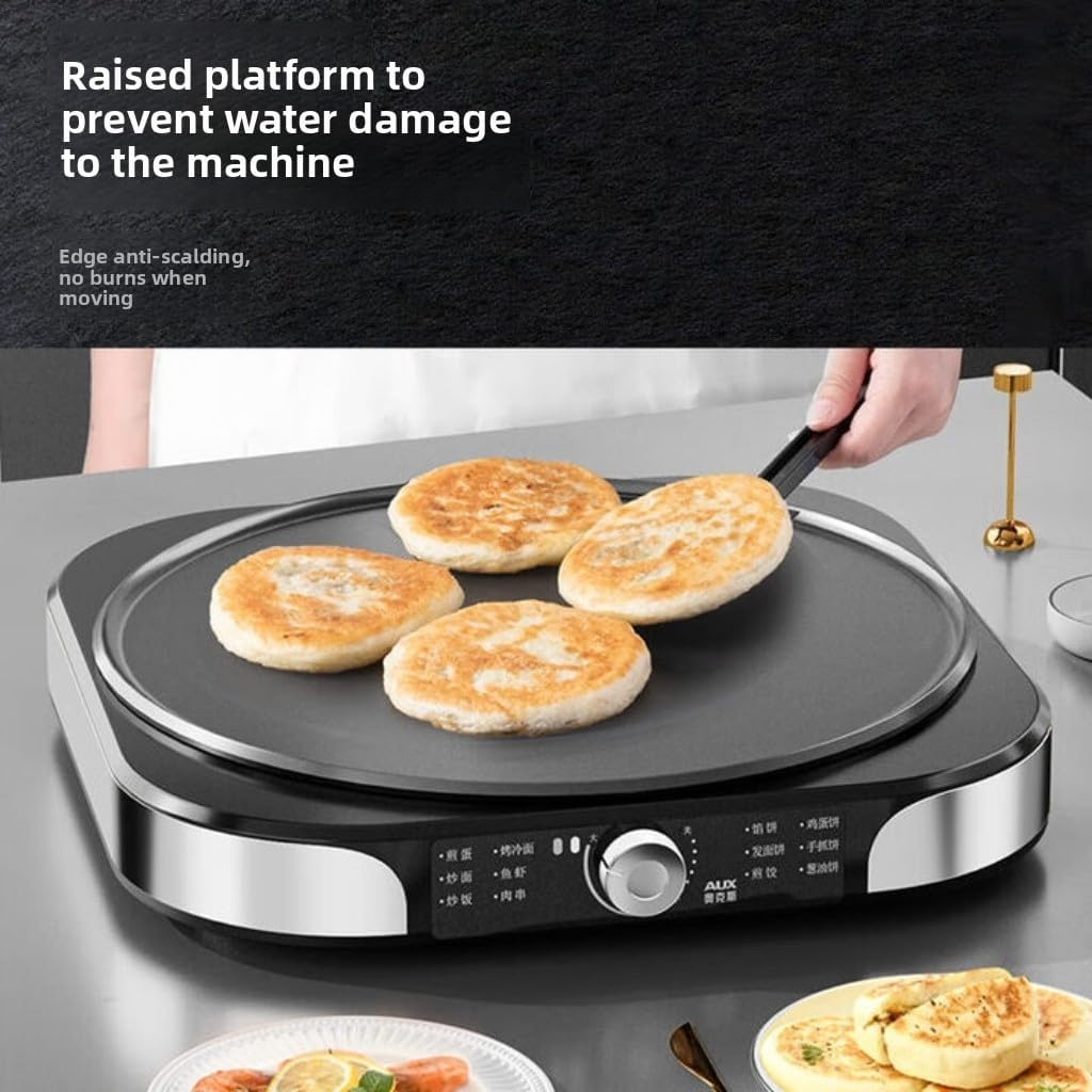Transform your kitchen into a professional cooking station with this versatile AUX Electric Crepe Maker. Featuring a generous 15.7-inch cooking surface, this professional-grade griddle offers precise temperature control from 0°C to 230°C (32°F to 446°F), making it perfect for creating a wide variety of dishes. The large, evenly heated surface lets you craft perfect pancakes, delicate crepes, multigrain wraps, and even grilled seafood with restaurant-quality results. The independent temperature control knob allows for precise heat adjustment, ensuring optimal cooking conditions for different recipes. Whether you're preparing delicate French crepes, savory vegetable pancakes, or crispy grilled squid, this versatile appliance delivers consistent results every time. The sleek stainless steel and black design adds a modern touch to your kitchen while offering durability and easy maintenance. Ideal for both home cooks and entertaining, this crepe maker helps you explore diverse culinary possibilities with professional-level control.