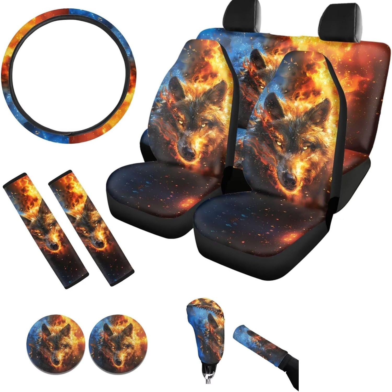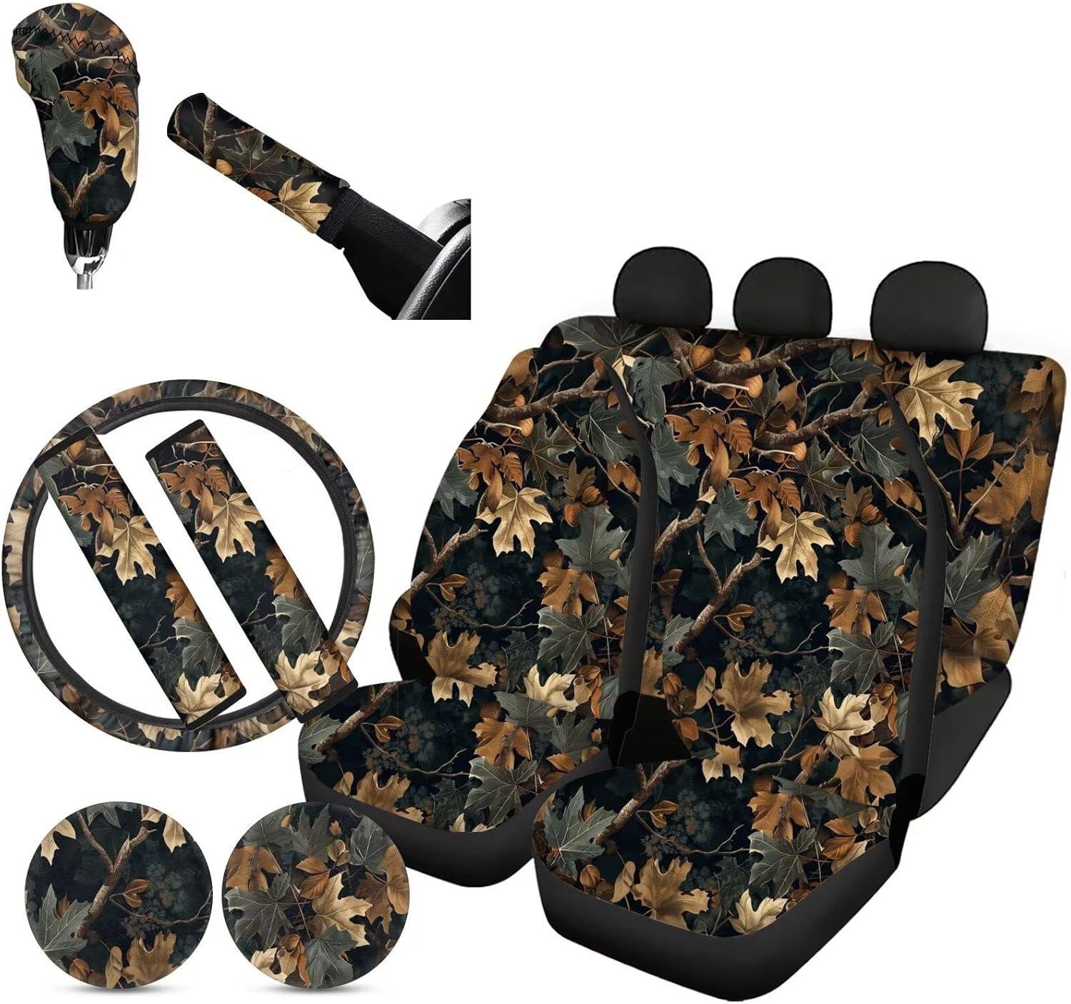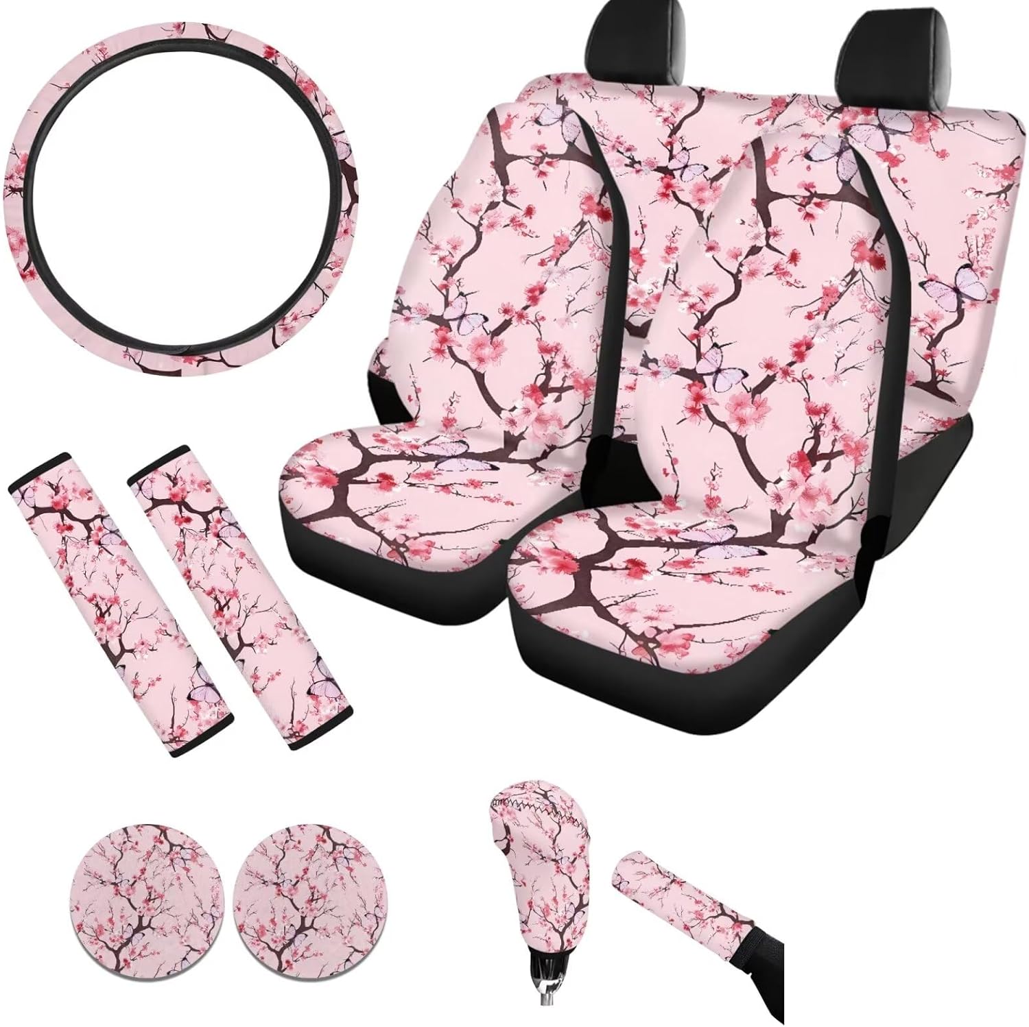 Package:All 11PCS,Includes 4pcs Seat Covers Full Set+2Pieces Seat Belt Covers+Steering Wheel Cover+2 Cup Holder Coasters+Gear Shift Cover+Handbrake Cover;These car seat covers is design to protect our car seat, bring more comfortable to our drivers. Suitable for almost universal automobile cars. Quick and easy installation,no ools required for installation. Pay attention to the Warining that these car seat covers should NOT be used on a seat with side airbags. Back Polyester fabric material, easy to clean and dry. washable ,no fading. Soft material keep hip and back comfortable in long time use. Keep your car seats from wear and stains. Add your own designs for a new look of your car's interior. Include two pieces of front seat cover. Elastic strap with hooks on the bottom of the seat covers, easy to install and remove. Universal-fit car seat covers will stretch to fit most car and SUV bucket style seats. Before buying please check whether your car seat is compatible.