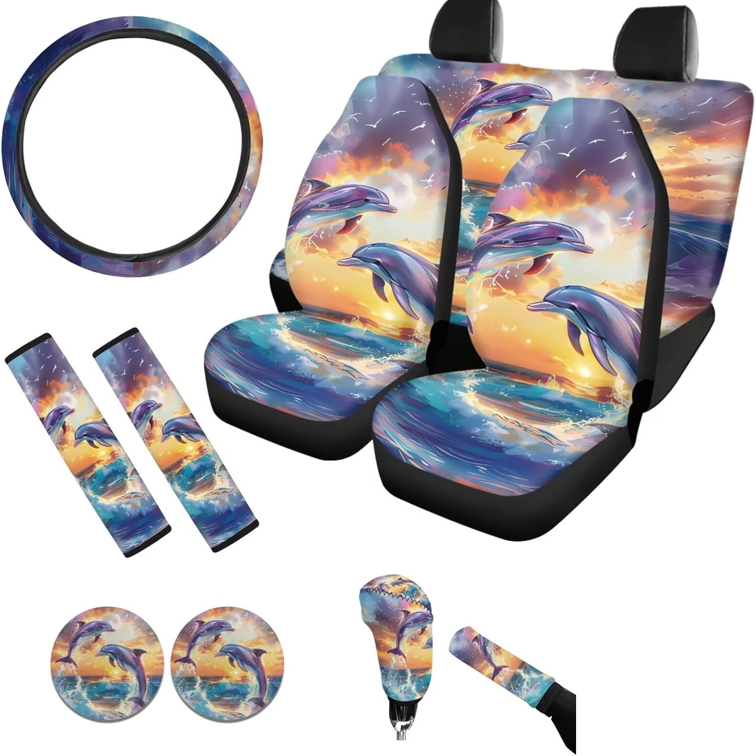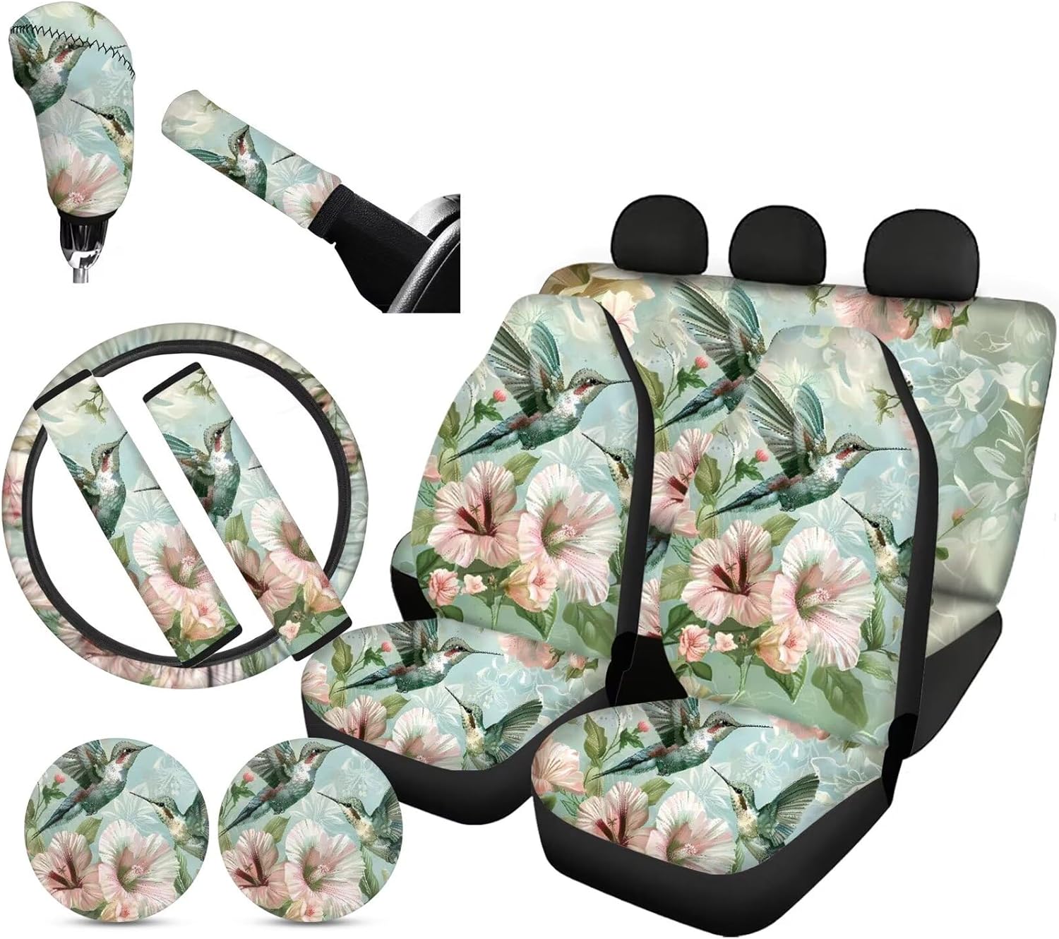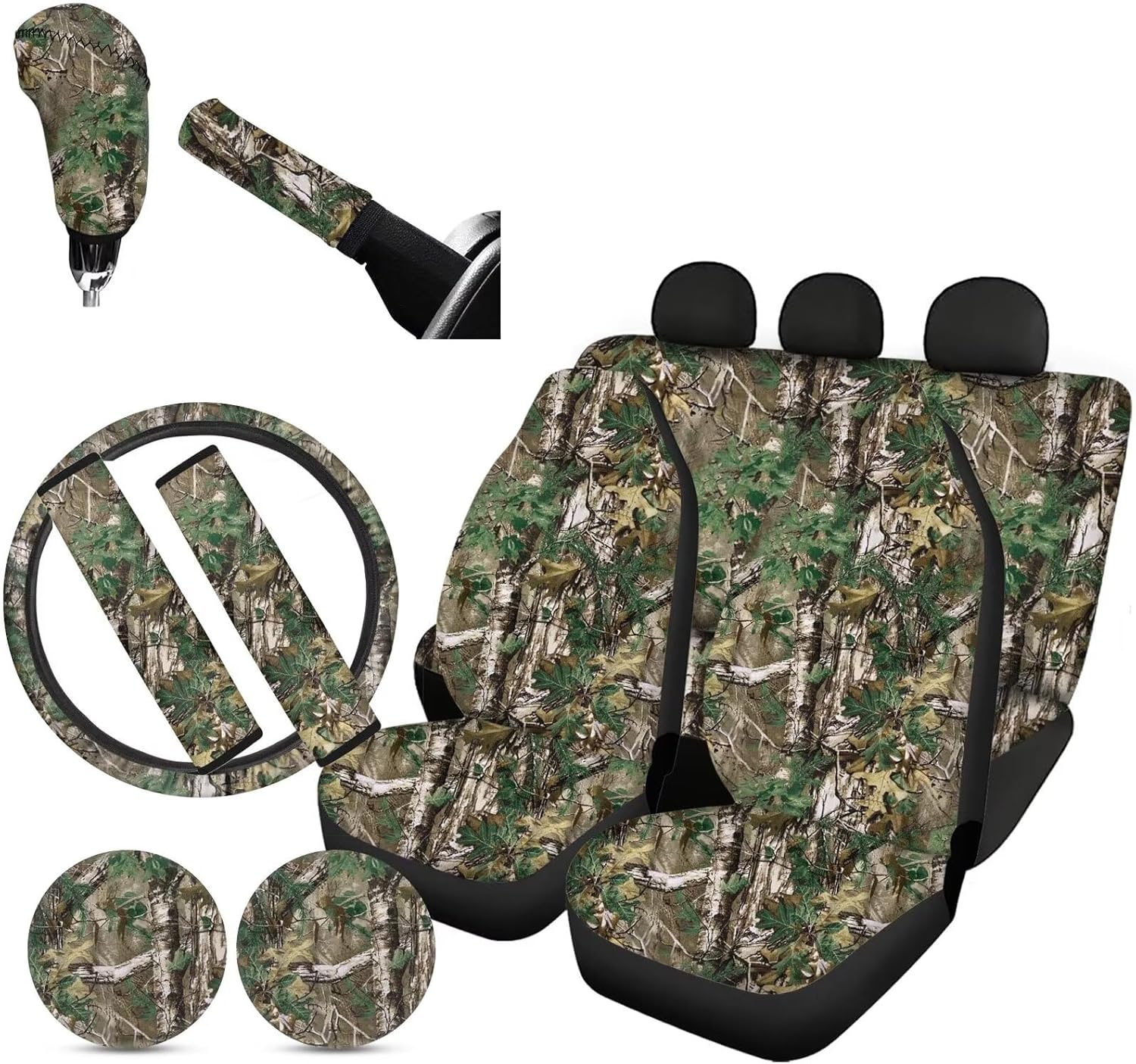 Package:All 11PCS,Includes 4pcs Seat Covers Full Set+2Pieces Seat Belt Covers+Steering Wheel Cover+2 Cup Holder Coasters+Gear Shift Cover+Handbrake Cover;These car seat covers is design to protect our car seat, bring more comfortable to our drivers. Suitable for almost universal automobile cars. Quick and easy installation,no ools required for installation. Pay attention to the Warining that these car seat covers should NOT be used on a seat with side airbags. Back Polyester fabric material, easy to clean and dry. washable ,no fading. Soft material keep hip and back comfortable in long time use. Keep your car seats from wear and stains. Add your own designs for a new look of your car's interior. Include two pieces of front seat cover. Elastic strap with hooks on the bottom of the seat covers, easy to install and remove. Universal-fit car seat covers will stretch to fit most car and SUV bucket style seats. Before buying please check whether your car seat is compatible.