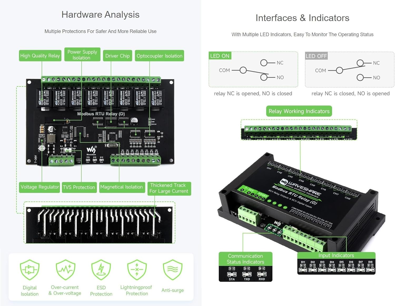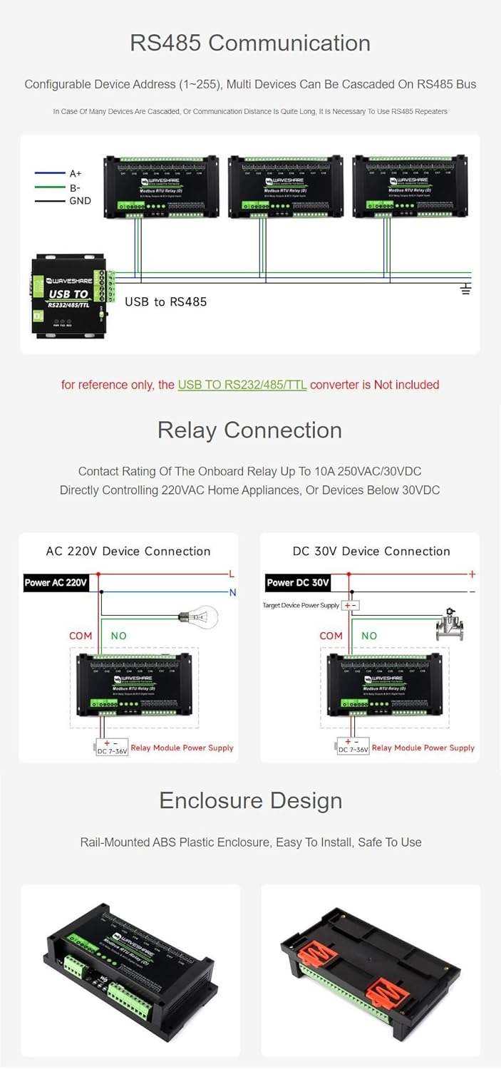 Features ● Configurable device address (1~255), multi devices can be cascaded on RS485 bus ● Features flash-on, flash-off function, by passing argument to the command, it is possible to turn on the relay for a while and then close it automatically ● Onboard unibody power supply isolation, provides stable isolated voltage, needs no extra power supply for the isolated terminal ● Onboard unibody magnetical isolation, allows signal isolation, high reliability, strong anti-interference, low power consumption ● Onboard resettable fuse and TVS (Transient Voltage Suppressor), effectively suppress surge voltage and transient spike voltage in the circuit, provides over-current/over-voltage proof, lightningproof & anti-electrostatic ● Onboard Optocoupler isolation, prevent the relay from being interfered by high-voltage circuit ● Adopts dedicated relay driver chip, with built-in flyback diode protection, for stronger and more stable driving ability ● Supports passive and active digital input, with bi-directional optocoupler isolation, built in debouncing algorithm. The relay supports digital input linkage control or toggle control ● Reverse-proof circuit, prevent the circuit from being damaged accidentally by incorrect connection ● High quality relay, contact rating: ≤10A 250VAC/30VDC ● Rail-mounted ABS plastic enclosure, easy to install, safe to use ● Multiple LEDs for indicating the MCU status and signal transceiving status Specifications POWER SUPPLY: 7~36V COMMUNICATION INTERFACE: RS485 RELAY CHANNELS: 8 DIGITAL INPUT: 8DI, 5~36V, passive / active input (NPN or PNP), built-in bi-directional optocoupler isolation COMMUNICATION PROTOCOL: Standard Modbus RTU protocol RS485 ADDRESS: 1~255 PACKAGE CONTENT 1. Modbus RTU Relay (D) x1 2. Screwdriver x1