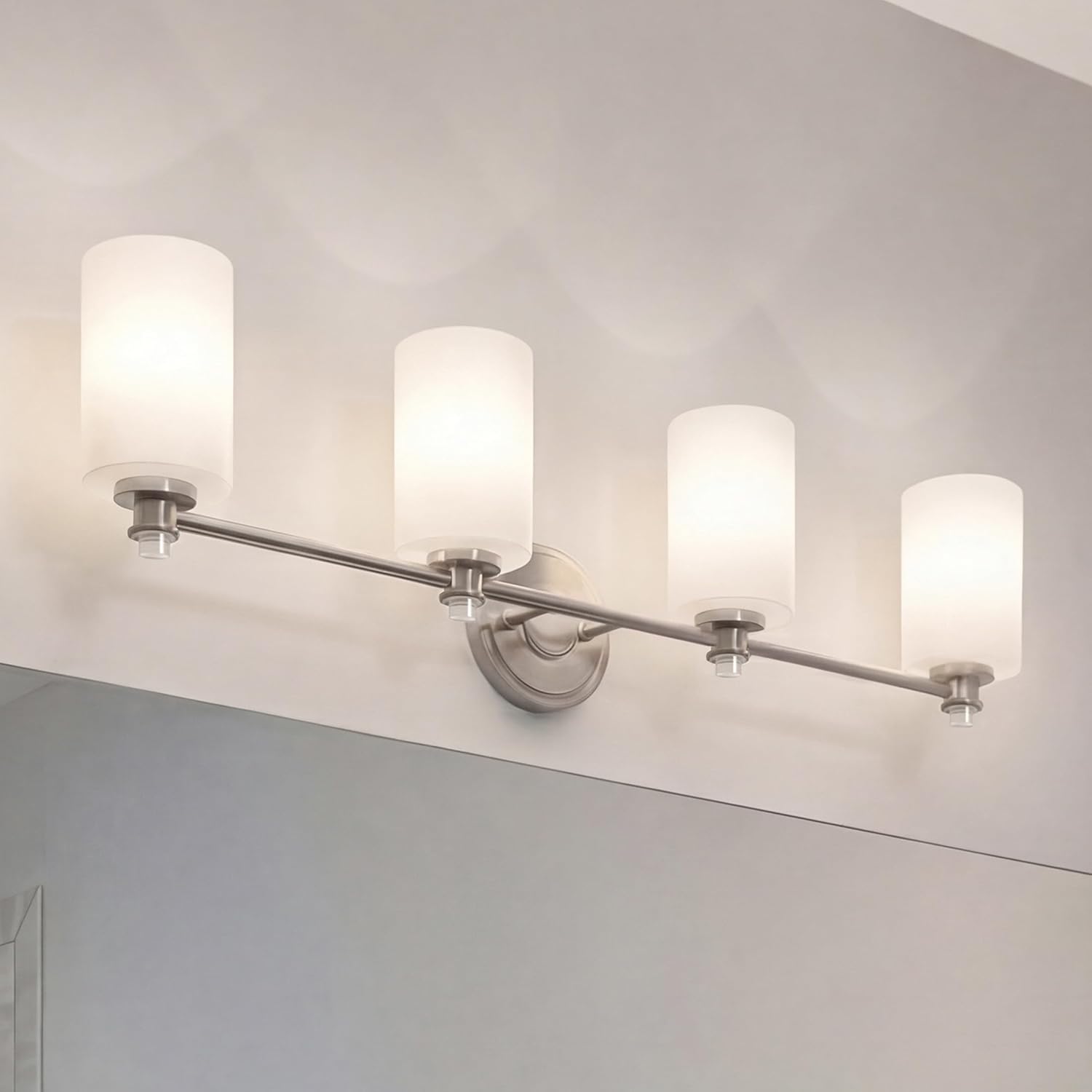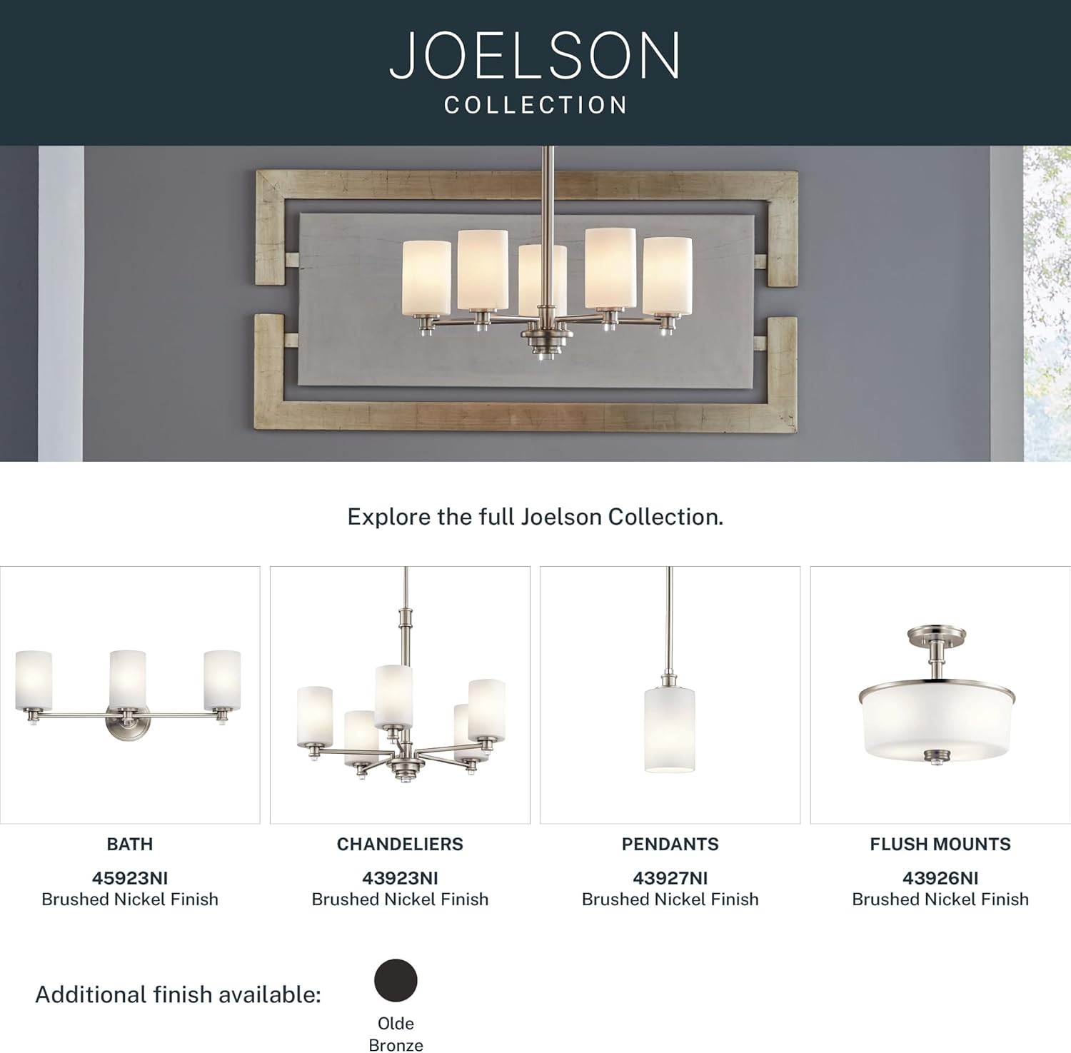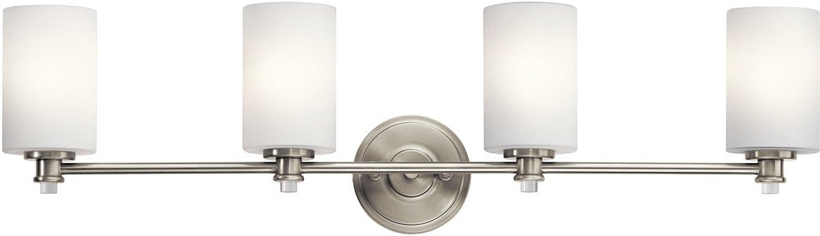 Joelson delivers a 4-light vanity that's transitional and versatile. This fixture showcases retro-inspired light bulb sockets with beautiful satin etched cased opal glass. For added ambiance, Joelson is appointed with a Brushed Nickel finish.