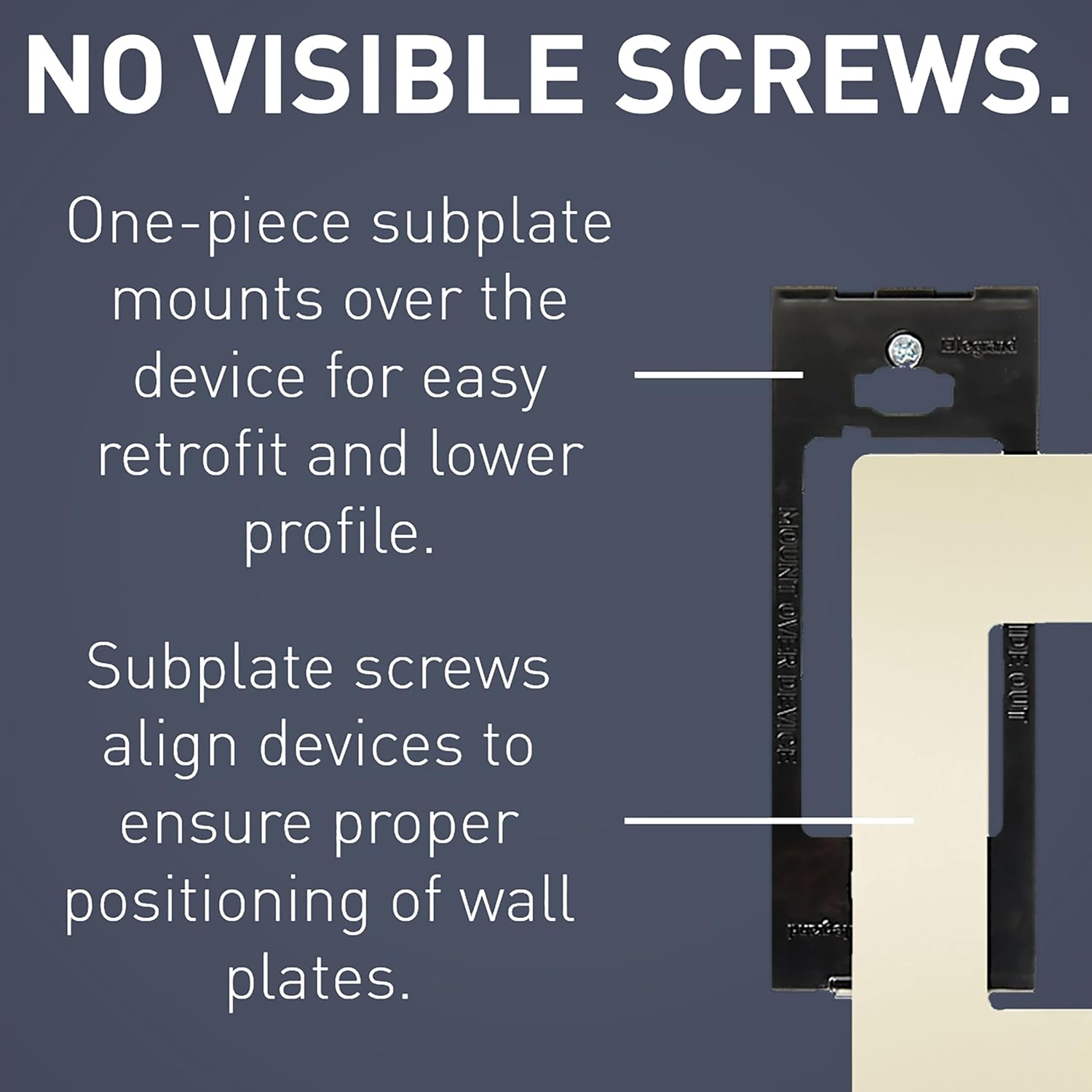 Adds a touch of sophistication to any space with a sleek, screwless face and low-profile. Sized to fit even over ragged openings for a seamless look. Designed to exclusively fit the designer switches, dimmers and outlets from the radiant Collection, snapping into place with ease. Ensures proper plate positioning with subplate screws. Molded of highly durable polycarbonate, Wall Plates from the radiant Collection are available in an array of classic colors and metallic finishes.