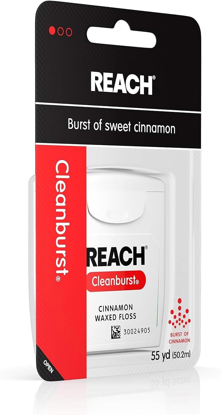 Experience a deep, refreshing clean with Reach Cleanburst Waxed Dental Floss in Cinnamon. Designed to effortlessly remove plaque and debris from hard-to-reach areas, this waxed floss glides smoothly between teeth, promoting healthier gums and a brighter smile. Infused with a burst of sweet cinnamon flavor, it leaves your mouth feeling fresh and invigorated after every use. Packaged in a convenient 55-yard dispenser, it's perfect for daily oral care. Keep your smile clean, fresh, and healthy with Reach Cleanburst!