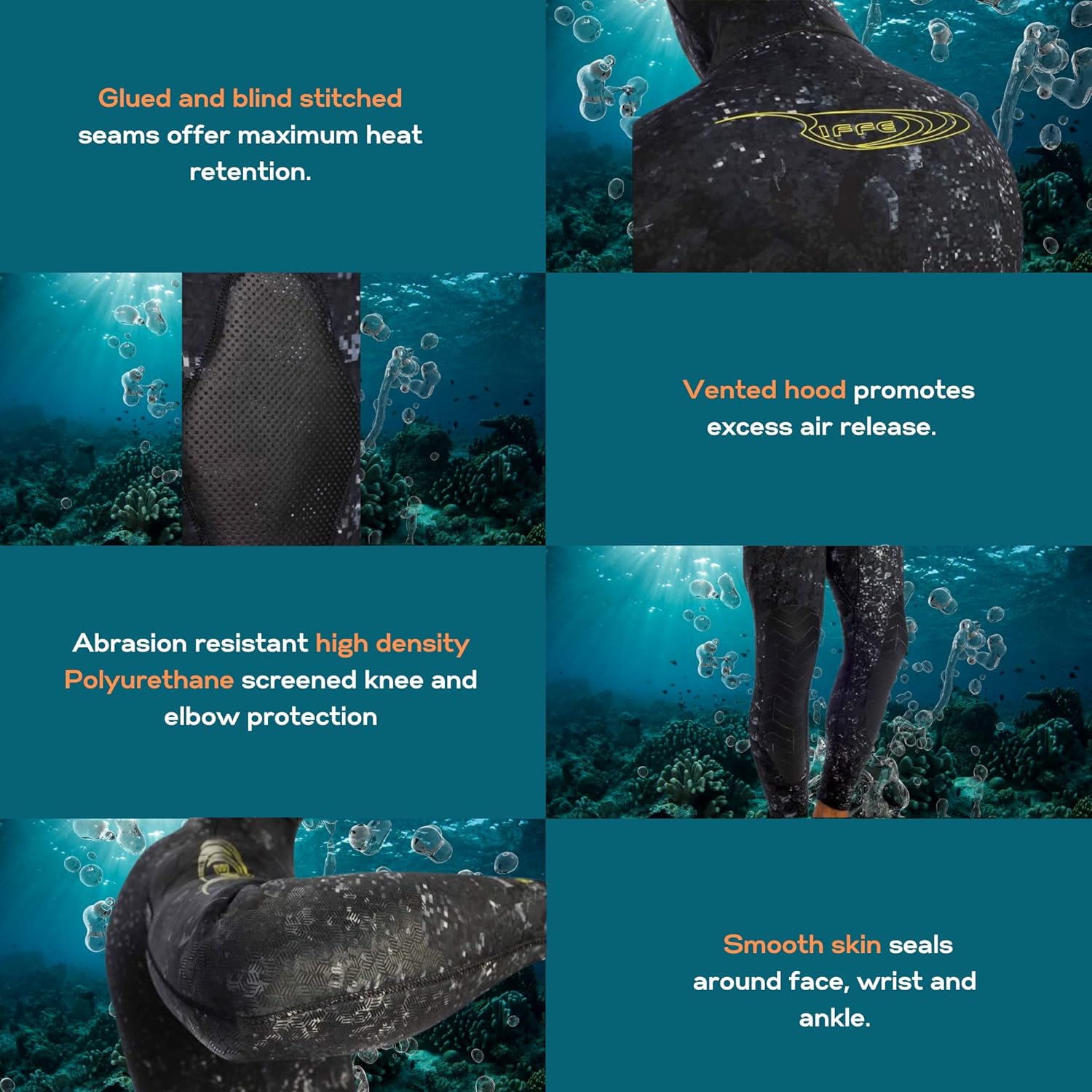 Riffe spearfishing wetsuits are one of the best in the world! RIFFE's NEW Vortex Camo wetsuit is constructed with Yamamoto 39 neoprene and our newly improved super stretch outer Lycra material, offering the diver a more flexible feel and better comfort when swimming through the water. The neck, face, wrist and ankle seals are completely camo.FEATURES:Yamamoto Neoprene (Grade 39) 100% CR neopreneOpen Cell Outer 100% Impermeaflex lamination for ultra 4 way stretchFace, wrist and ankle seals to prevent water entry Blind stitching100% waterproof and airtight protective knee and elbow abrasion resistant screenprintNew improved anti-slip cushioned chest loading padLocking dual clip beaver tailVented hood to help release excess airTHICKNESES3.5mm - 2 Piece - High Waist Pants - Full Wetsuit5mm - 2 Piece - High Waist Pants - Full Wetsuit7mm - 2 Piece - Long John Pants - Full WetsuitSIZESS 48 125 – 150 5’3″ – 5’7″M 50 135 – 165 5’4″ – 6’1”ML 52 165 – 180 5’6″ – 6'1”L 54 170 – 180 5’7″ – 6’1″XL 56 180 – 200 5’8″ – 6’3″XXL 58 190 – 205 5’9″ – 6’5″
