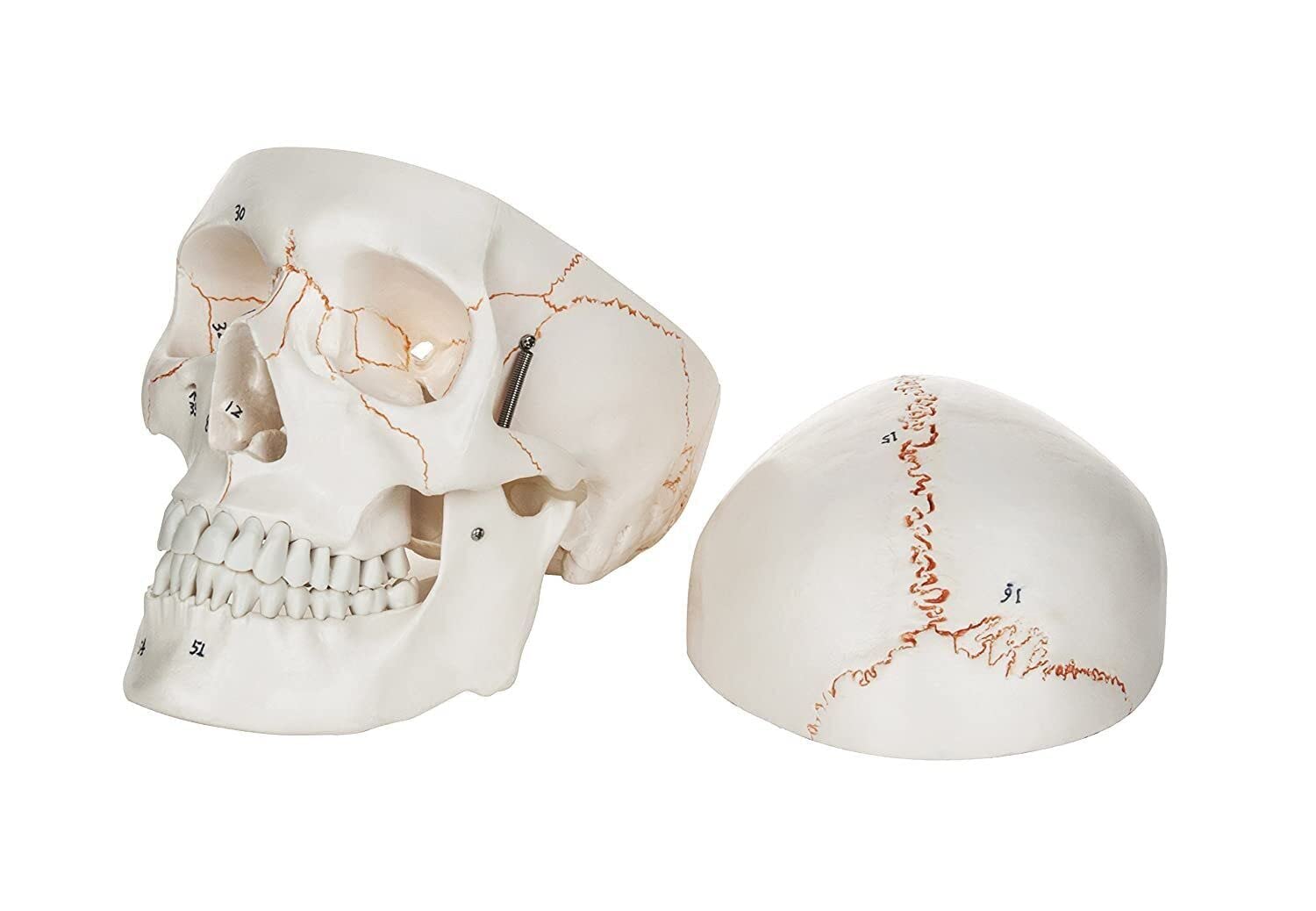 Human Skull Model with Removable Calvarium, Anatomical Model, PVC plastic Made of high quality PVC plastic which is which is corrosion and rust resistant and is durable Medical Grade Human Skull. Jaw is spring loaded. Cast from an original human skull Life Size 3 part human skull with removable calvarium With detailed study manual representing all the features that are numbered