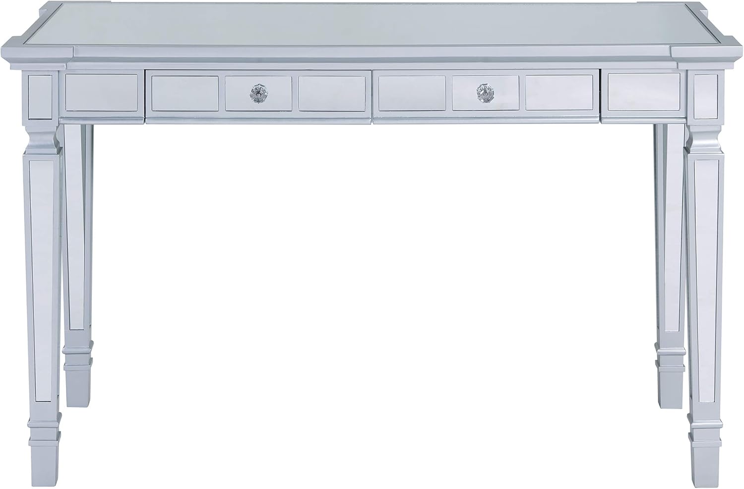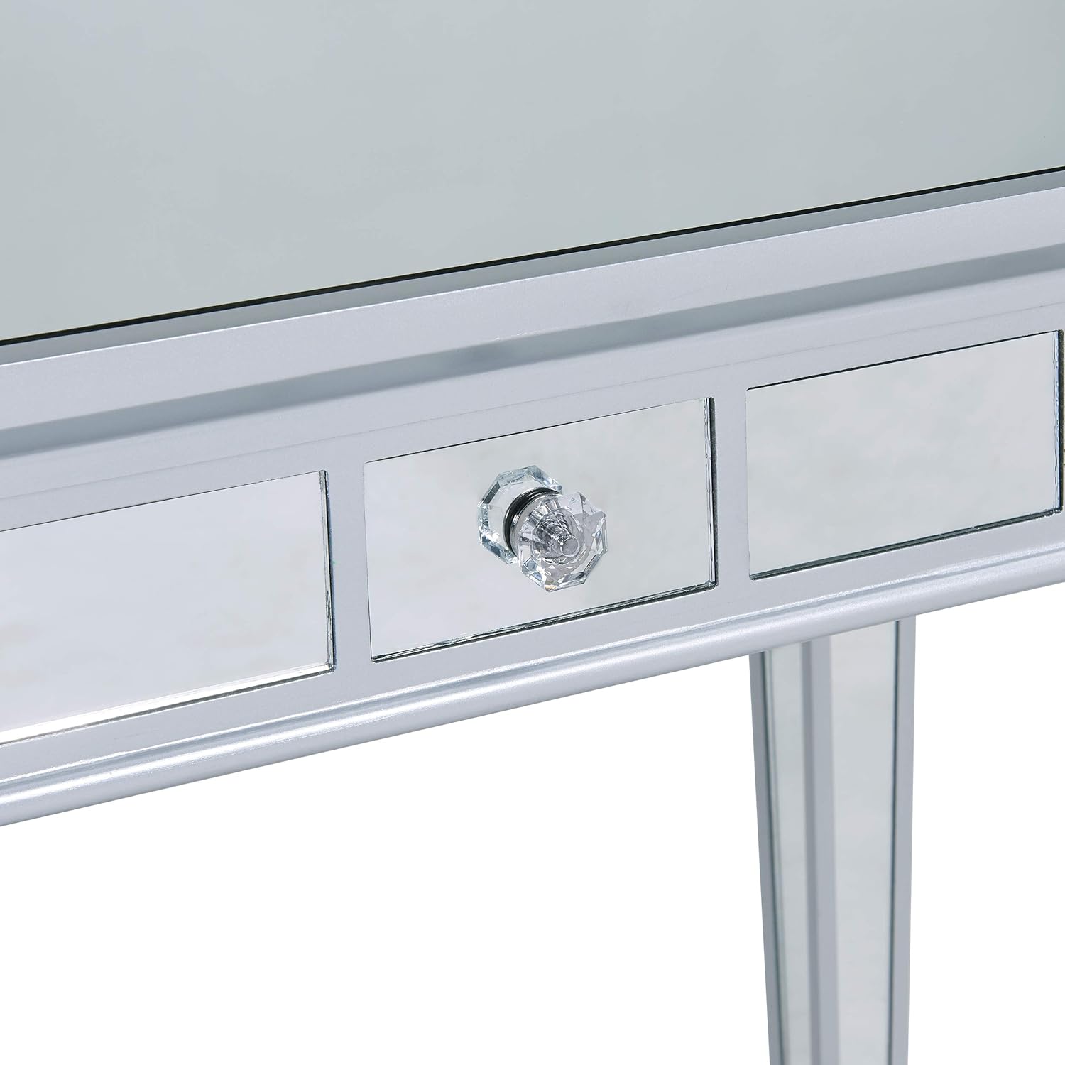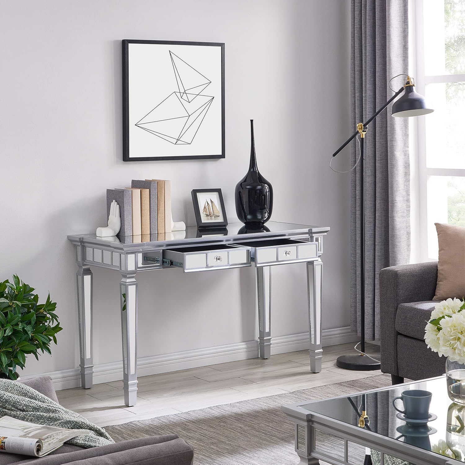 Embrace your glamorous side with this sophisticated, mirrored writing desk. Shimmering tiles cover nearly every surface, bordered with matte silver, Canvasing the entirety of the desk with visually appealing lines. Faux crystal knobs provide a glam look, opening to storage drawers that keep your work space tidy. The spacious desktop provides abundant work space to complete your projects or assignments. Upgrade your home office or open concept flat with this elegant mirrored desk.