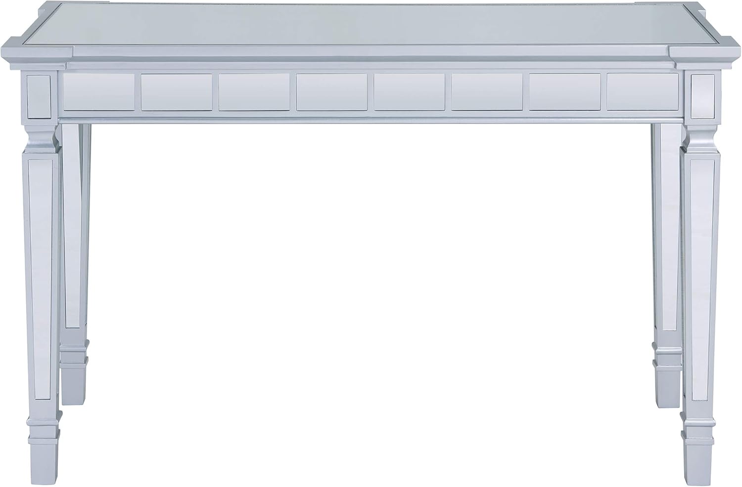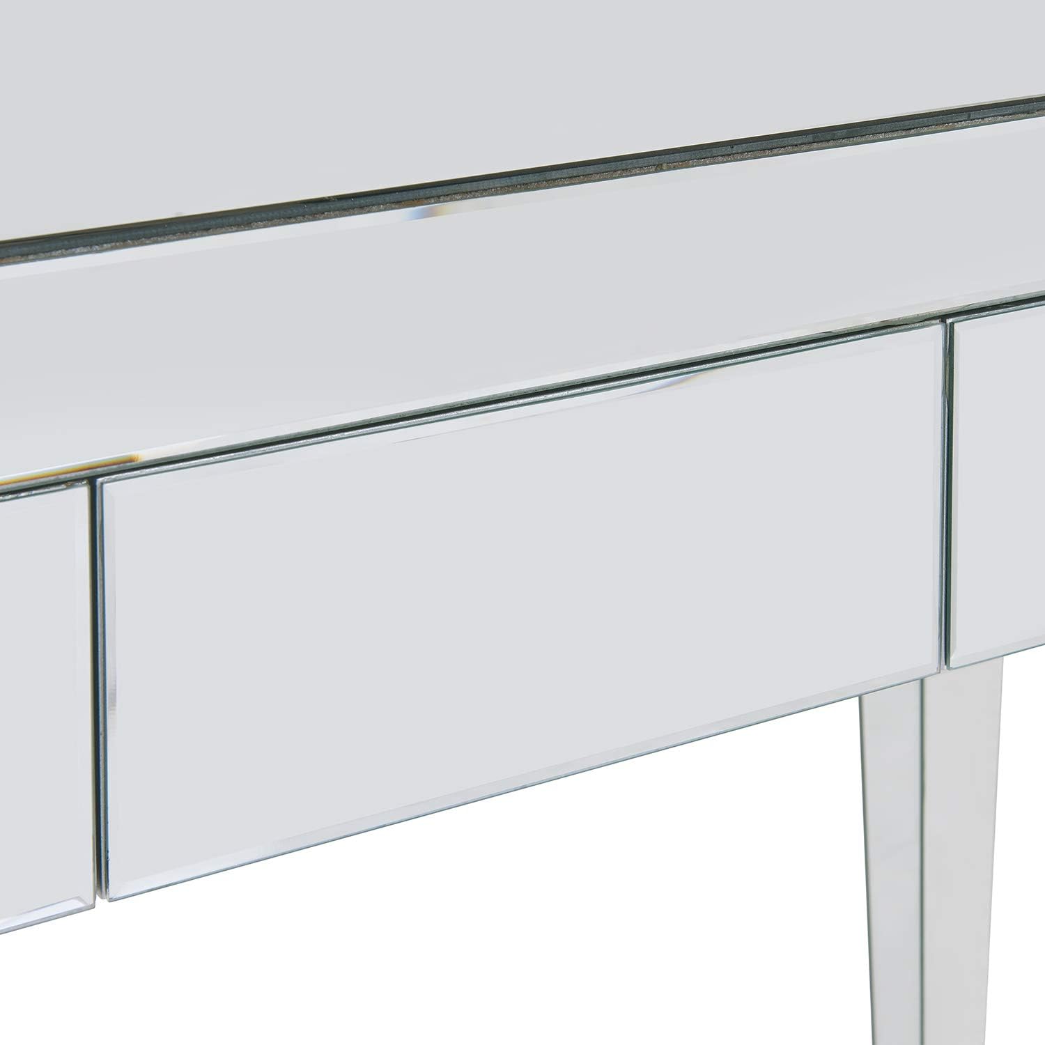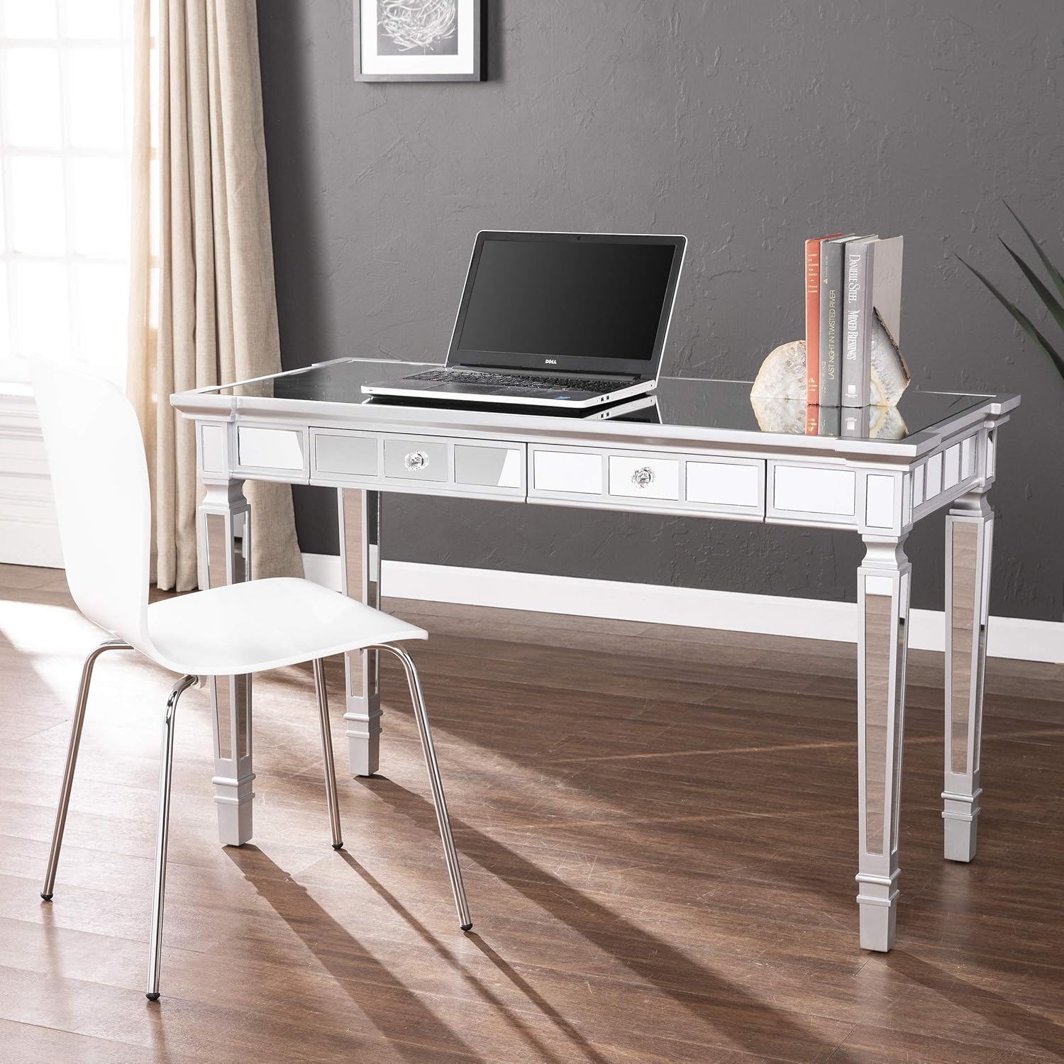 Embrace your glamorous side with this sophisticated, mirrored writing desk. Shimmering tiles cover nearly every surface, bordered with matte silver, Canvasing the entirety of the desk with visually appealing lines. Faux crystal knobs provide a glam look, opening to storage drawers that keep your work space tidy. The spacious desktop provides abundant work space to complete your projects or assignments. Upgrade your home office or open concept flat with this elegant mirrored desk.