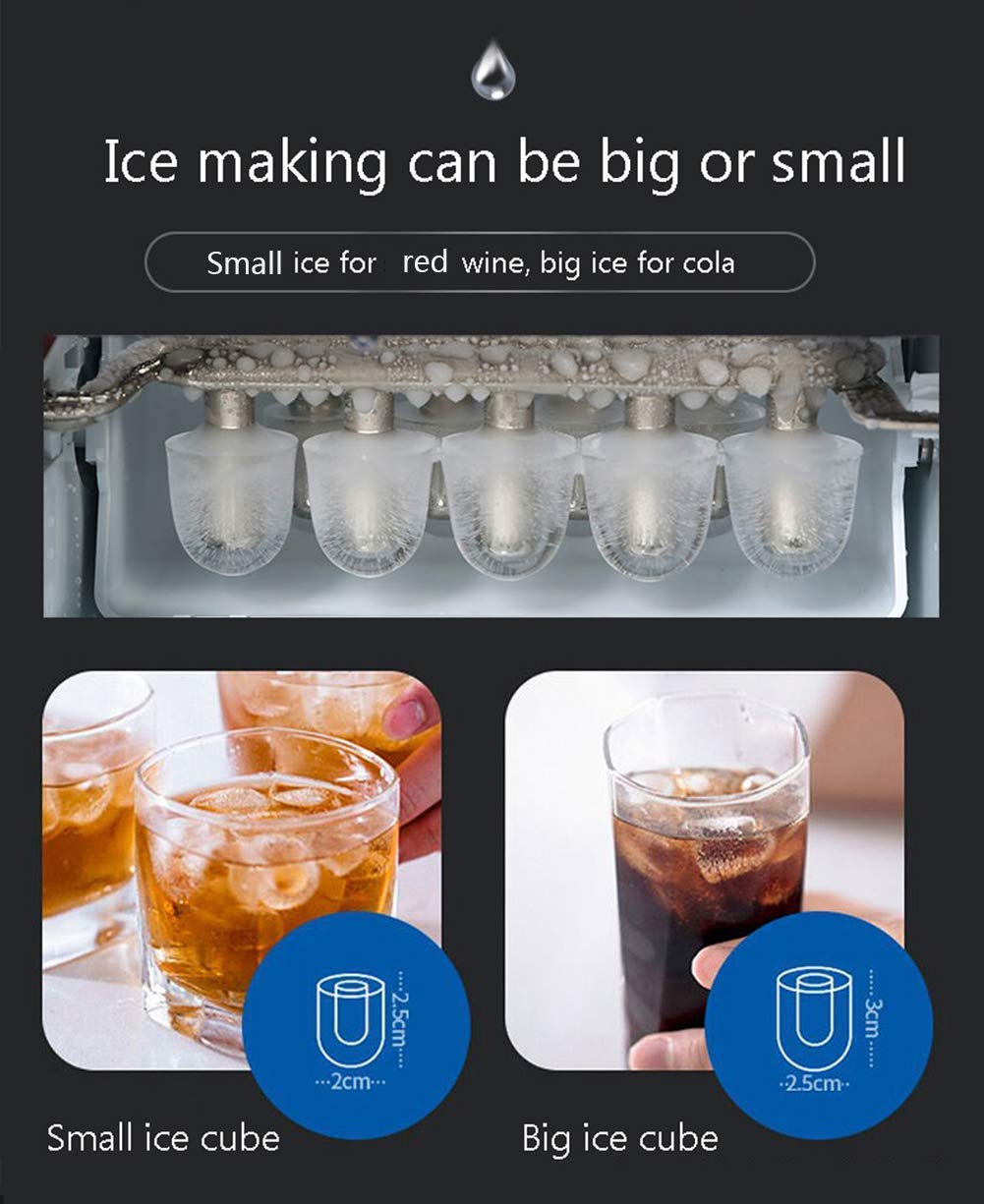 "welcome to our shop happy shopping! All our products are thoroughly tested, inspected and packaged before delivery. If you have any questions, please feel free to contact us so that we can provide you with the best service." QUIET AND ENERGY EFFICIENT ICE MACHINE countertop Ice Maker Achieves Low Noise Level,Fast Cooling Effect And Low Consumption With Powerful Compressor,High Quality Copper Aluminum Fin Condenser. easy operation with Simple Control Panel,Just Add Water,Plug It In,Press The Power Button,Select The Ice Size And Wait For Ice Cubes. product Parameters: material:Abs 24h Make Ice:15kg voltage:220v/50hz power:180w single Ice:9 Piece ice Shape:Round Bullet Ice Ice Size:2 Kinds water Tank:2.2l oncemake Ice Time:-9 Minutes machine Weight:5kg product Size:250x350x325mm(9.8x13.x12.8inch) 100% Satisfaction Guaranteed:Customer Satisfaction Is Of Utmost Importance To Us.please Contact Us If Any Problems,And We Will Give You A Satisfied solution! "prompt: 1. Due to lighting effects/environment, display brightness settings, etc., the actual item color may be slightly different. 2. Regarding the size, due to manual measurement, please allow a difference of 1-2 cm, thank you! Hope to provide you with better service. If you have any questions, please feel free to contact us ""wmpa""!"