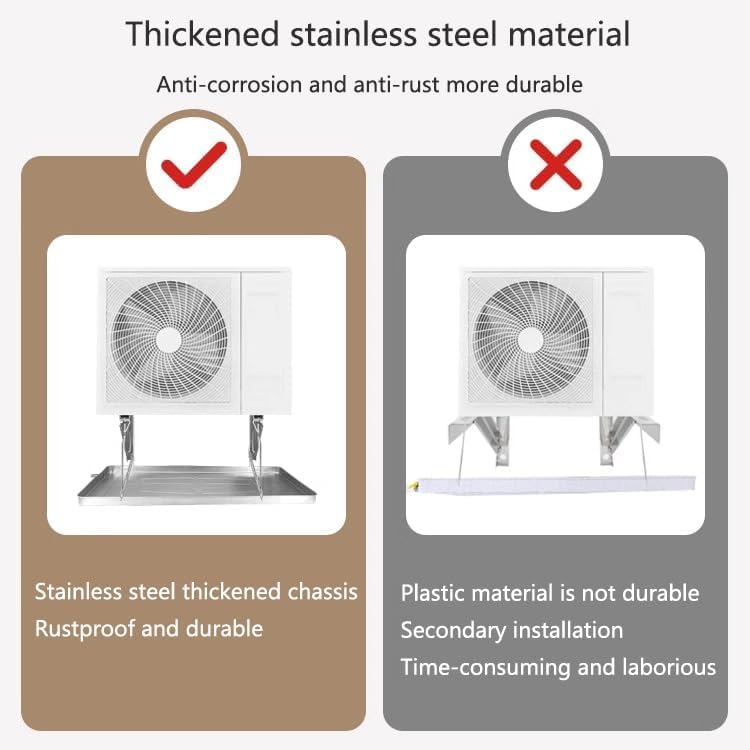 Upgrade your air conditioning system with our premium Air Conditioner Drip Pan, designed to effectively manage water drainage and protect your outdoor space from potential water damage. Each package includes 1 durable AC drain pan, a 2m drain hose, a clamp, wire, and 4 shock pads, ensuring you have everything needed for a complete installation. Crafted from high-quality stainless steel, our drip pan showcases exceptional durability, making it a reliable choice for both residential and commercial use. Its user-friendly design features four mounting holes, allowing for quick and easy installation in under a minute, suitable for individuals of all skill levels. With three size options, our drip pan caters to various air conditioner models: - L: 85*W: 39*H: 3cm (33.4*15.3*1.2in) for units under 85cm, ideal for 1-2P air conditioners. - L: 93*W: 45*H: 3cm (36.6*17.7*1.2in) for outdoor units 85cm-93cm, perfect for 3-5P air conditioners. - L: 100*W: 47*H: 3cm (39.3*18.5*1.2in) designed for units above 93cm, suitable for 5-6P air conditioners. Please ensure the dimensions of the drain pan exceed the actual size of your outdoor unit for optimal performance. This air conditioner drip pan not only prevents water leakage but also enhances the efficiency of your cooling system, extending its lifespan. Ideal for homeowners and businesses alike, our product offers peace of mind by safeguarding your property while ensuring your air conditioning unit operates smoothly. If you have any questions or need assistance, our dedicated support team is here to help you enjoy a seamless shopping experience.