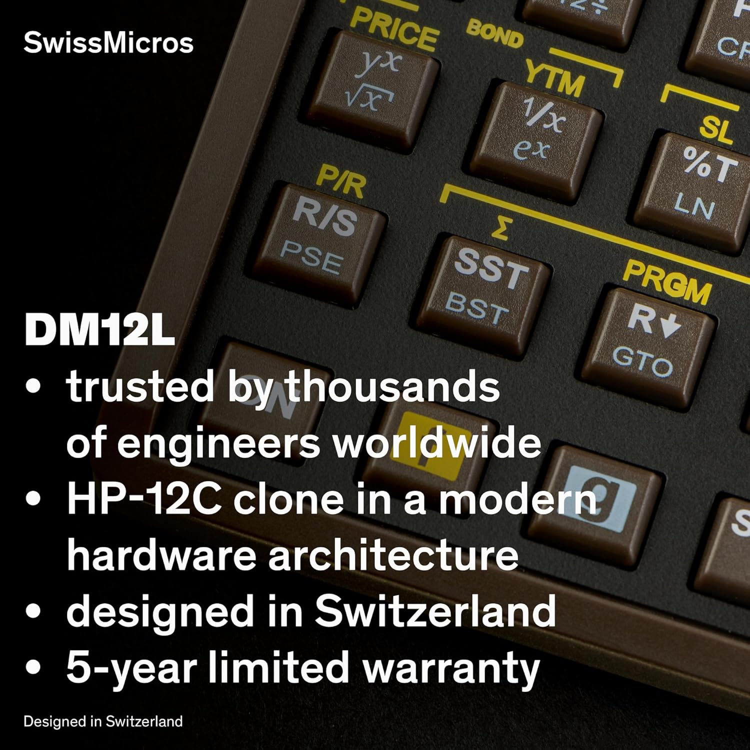 The executive instrument for global finance. The SwissMicros DM12L is a high-performance financial calculator for professionals who require absolute reliability. While the original HP-12C became the standard for banking and real estate, the DM12L elevates that heritage with a precision-machined Grade 1 Titanium housing. This sand-blasted, brown-anodized shell provides a level of durability and professional weight that plastic alternatives cannot match. Built for investment bankers, actuaries, and real estate professionals, the DM12L handles everything from simple interest to complex bond yields and depreciation schedules with the efficiency of the classic RPN logic system. Precision and automation. The DM12L features an intuitive programming mode that functions like a computer macro, allowing you to record repetitive calculation steps and execute them with a single keypress. With 99 lines of programmable memory and support for logical operators, it significantly reduces the risk of manual entry errors during critical financial modeling. The latest V33 firmware update brings this classic layout into the modern era with a 2-line display mode for opcode viewing and a new setup menu for streamlined access to configuration items. Whether calculating Net Present Value (NPV), Internal Rate of Return (IRR), or performing date arithmetic, the DM12L provides the speed and stability required for high-stakes decision making. An heirloom for the modern professional. We believe a professional tool should be an investment. The DM12L is a buy it for life instrument, featuring laser-engraved key legends that never fade and a premium build quality. The inclusion of a USB port allows for easy firmware updates and complete memory backups, ensuring your custom programs and financial states are secure. It is the ultimate tribute to a financial icon, refined for the modern executive who values heritage and state-of-the-art manufacturing.