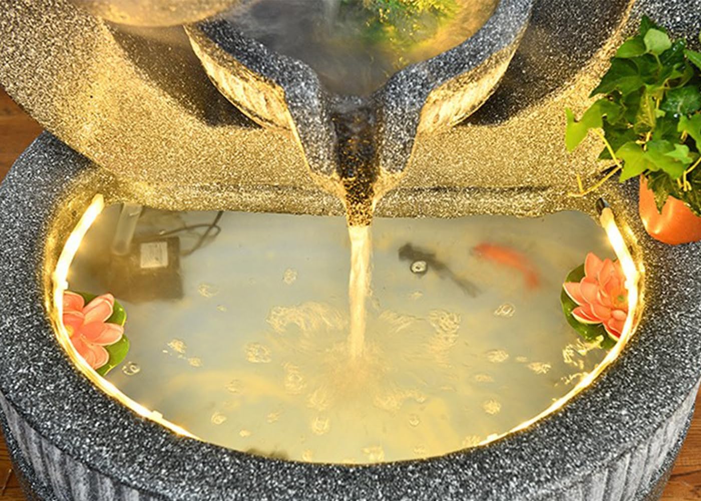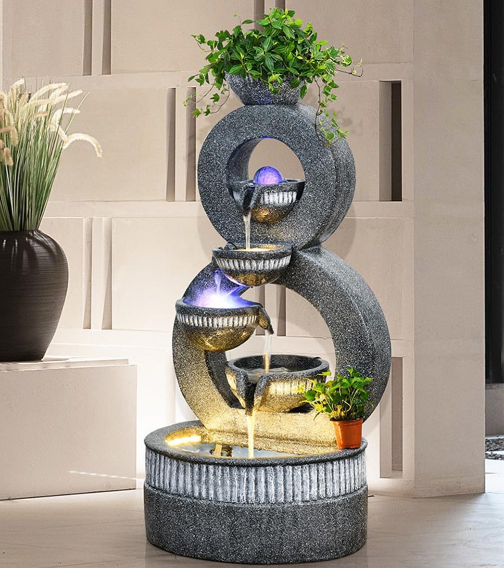 Bring Serenity and Nature into Your Space with a Tiered Ring Water Fountain Elevate the ambiance of your home, garden, or patio with this elegant Tiered Ring Water Fountain. Designed with a modern circular structure, this fountain features cascading water that flows gently through multiple tiers, creating a soothing and peaceful atmosphere. The built-in planter at the top allows you to add greenery, enhancing the natural beauty of the fountain, while the integrated LED lights add a magical glow to the flowing water, making it an enchanting piece for day or night.