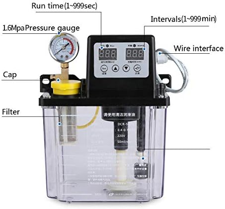 Parameter: 1. Oil Pump volume: 1Lbr> 2. Voltage: 220V (if you need 110V, please feel free contact us.)br> 3. Pressure: 0.6~0.7Mpabr>br> 4. The discharge amount: 50ml / minbr> 5. Use oil viscosity range: 15-68c.stbr> 6. Applies resistance systemsbr> 7. The Oil Pump has an oil level alarm systembr> 8. Oil Pump time settings: working time from 1 to 999 seconds; downtime from 1 to 999 minutesbr> 9. Interface tubing diameter: 4mmbr> 10. Power:28Wbr> 11. Floor area ratio: ≥75%br> 12. Current: 0.35Abr> 13. Rated pressure: 10kgbr>br>br> Package Included:br> 1 x 1L lubrication Oil Pump with Pressure gauge