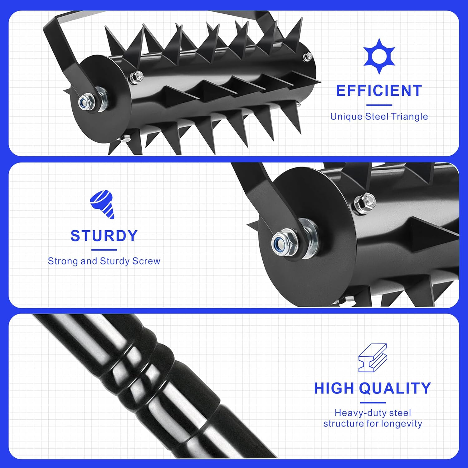 This Upgraded Heavy Duty Lawn Aerator Tool is the perfect solution for maintaining a lush, green lawn. Designed to improve soil health, it features durable, rust-resistant spikes that penetrate deep into the soil to reduce compaction, allowing essential nutrients, water, and air to reach grass roots. The manual design makes it easy to use with minimal effort, helping you achieve deep soil aeration for better grass growth.The tool's ergonomic handle is lightweight and easy to maneuver, ensuring a comfortable grip with less back strain. Whether you're caring for a small yard or a large garden, the spike aerator works efficiently on both hard and soft soils, breaking up the compacted earth and promoting healthy soil conditions.This aerator is quick to assemble and disassemble with the included tools, and its space-saving design makes it perfect for easy storage when not in use. The ideal choice for homeowners, gardeners, or farmers looking to improve lawn health, this lawn aerator tool is designed for maximum convenience, efficiency, and durability.Product Features:Heavy-Duty Construction: Made with rust-resistant and durable materials, this aerator is built to last, ensuring long-term reliability and performance in all outdoor conditions.Efficient Soil Penetration: The spikes are designed to penetrate deep into the soil, reducing compaction and allowing air, water, and nutrients to reach the grass roots, promoting healthy lawn growth.Ergonomic Design: With a lightweight, ergonomically designed handle, this aerator is easy to maneuver, reducing strain on your back and arms while providing a comfortable and efficient aeration experience.Easy Assembly & Storage: Quick to assemble and disassemble, the compact design of the tool allows for simple storage when not in use, ensuring space-saving convenience.Versatile for All Lawn Types: Ideal for use on both hard and soft soils, this aerator is suitable for lawns, gardens, and small farmlands, helping to improve soil aeration and promote lush, healthy grass.Product Specifications:Assembled Dimensions:Length: 56.00 inchesWidth: 16.00 inchesHeight: 6.00 inchesProduct Weight: 7.50 lbsPackaging Dimensions:Length: 17.30 inchesWidth: 9.50 inchesHeight: 9.00 inchesPackaging Weight: 8.00 lbsThis Upgraded Heavy Duty Lawn Aerator Tool is the ultimate choice for anyone looking to improve lawn health. Whether you're maintaining a small yard or a large garden, this tool’s ergonomic design and efficient soil aeration will make your lawn care tasks easier and more effective.
