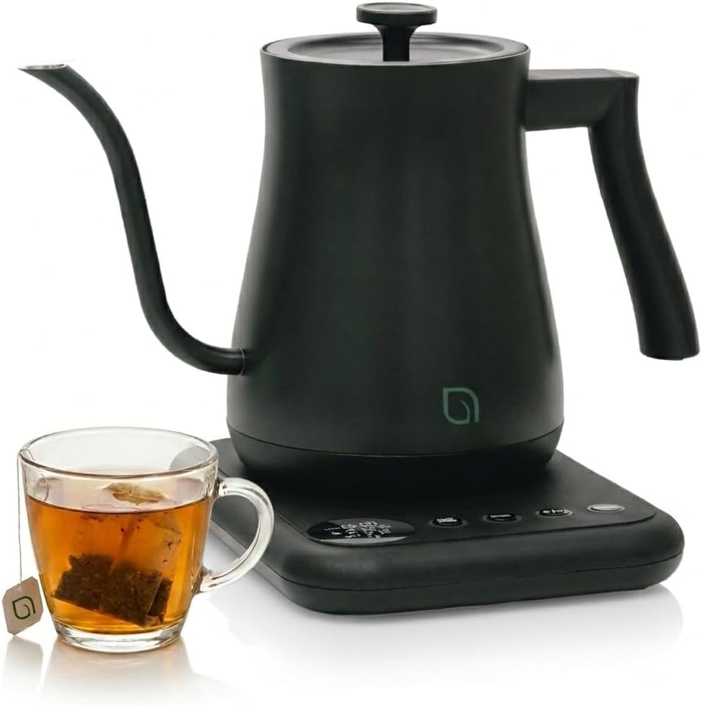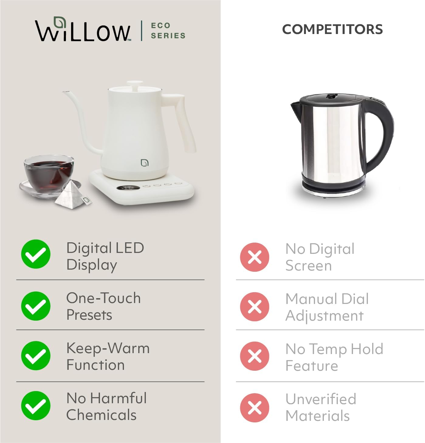 Here at Willow, we believe great kitchen appliances should care for the planet as much as they do for your home. Every product we make reflects that belief — crafted with purpose, built to last, and designed to elevate your everyday routine. Our kitchen appliances combine modern aesthetics with real sustainability, using 99% GRS-certified post-consumer recycled plastics and materials that are BPA-free, PFOA-free, PTFE-free, and PFAS-free. The Willow Gooseneck Electric Kettle embodies that balance of design, performance, and environmental responsibility. Designed in NYC, this sleek electric kettle blends elegance with precision. The ergonomic gooseneck spout allows for steady, accurate flow — ideal for pour-over coffee or loose-leaf tea — while the 1200W fast-heating system quickly brings up to 1.0L of water to a boil. With five temperature presets and variable control from 100°C–212°F, you’ll enjoy perfect results for every brew — whether using it as a tea kettle, hot water kettle, electric tea kettle, or water boiler kettle electric. The digital display makes it easy to read and adjust, and the 1-hour keep-warm function keeps your water ready whenever you are. Crafted from durable stainless steel with a matte black finish, this electric kettle gooseneck is as beautiful as it is functional. Compact yet powerful, it fits seamlessly into any space — whether you need a small electric kettle, portable kettle, or temperature control kettle for home or office use. Perfect as a gift-ready electric water kettle for coffee and tea lovers, the Willow Gooseneck Kettle is where style meets sustainability. Every pour supports a cleaner planet and a more mindful way to live. Cook with Willow – Save the Planet.