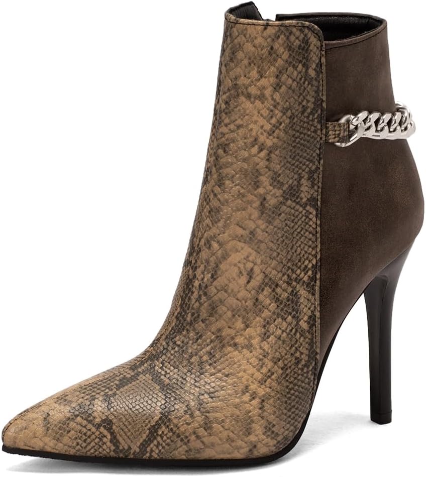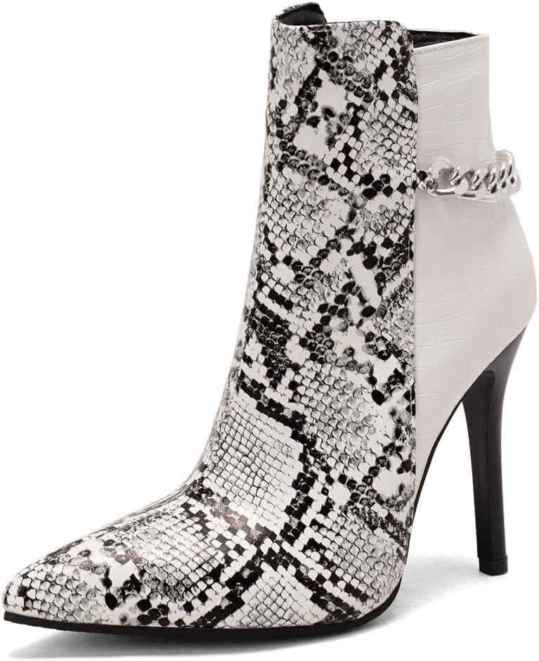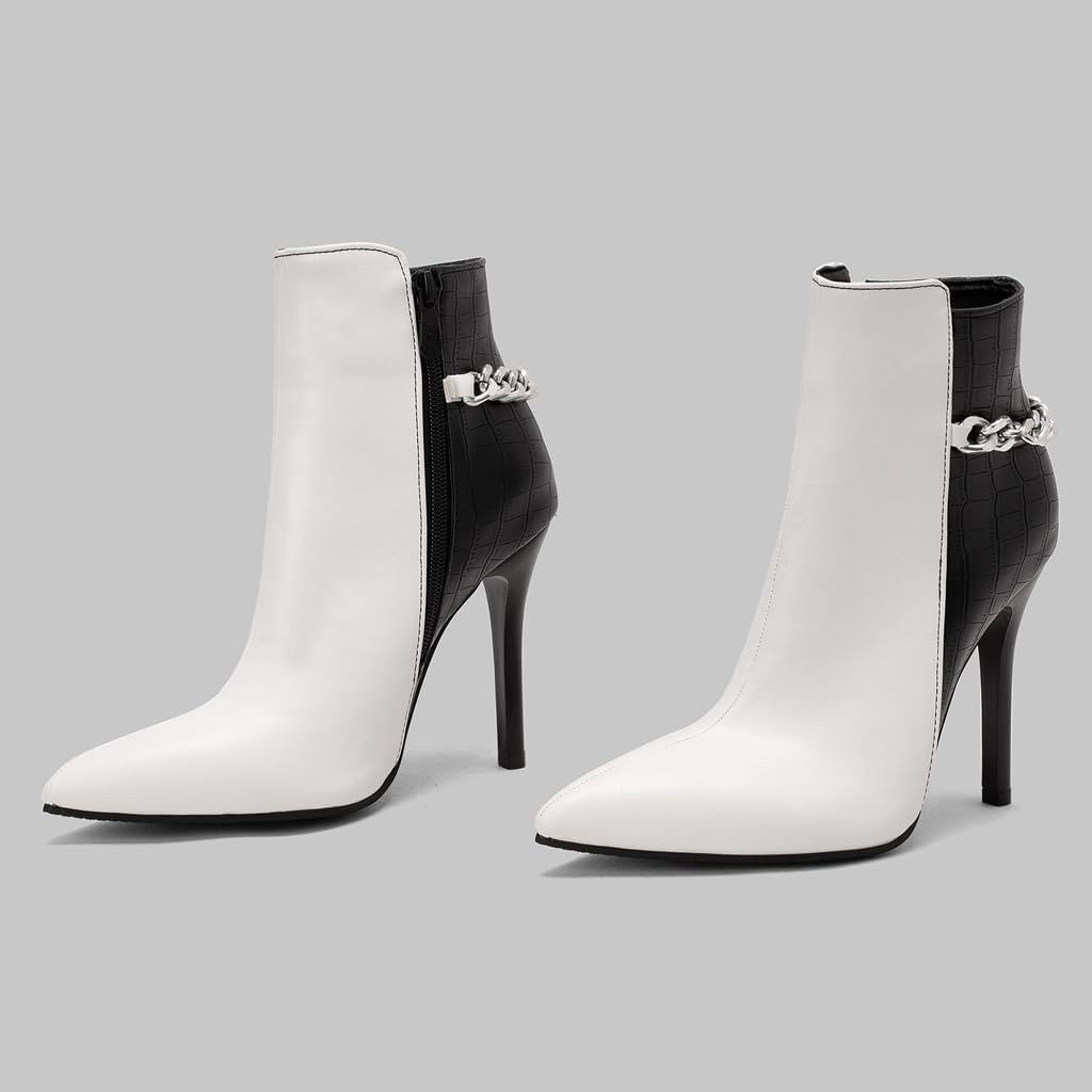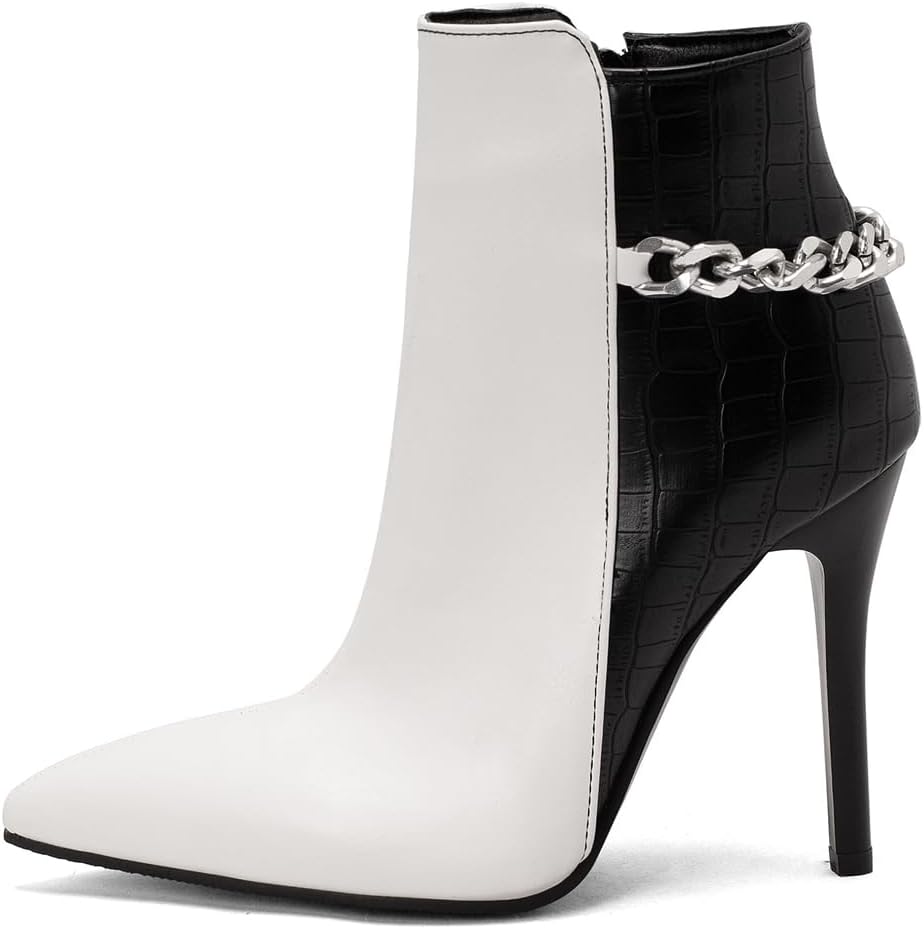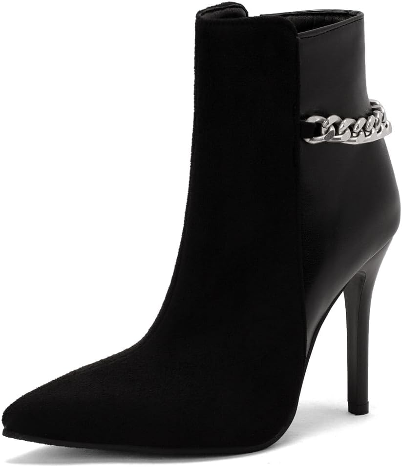 Women's Pointed Toe Dressy Ankle Boots Chain Zipper Stiletto High Heels Winter Fall Short BootiesSize Chart:Size 4 US = EU34 = Heel to Toe 22.0cm/8.66"Size 4.5 US = EU34 =Heel to Toe 22.0cm/8.86"Size 5 US = EU35 = Heel to Toe 22.5cm/9.06"Size 5.5 US = EU36 = Heel to Toe 23cm/9.06"Size 6 US = EU37 = Heel to Toe 23.5cm/9.25"Size 6.5 US = EU37 = Heel to Toe 23.5cm/9.25"Size 7 US = EU38 = Heel to Toe 24cm/9.45"Size 7.5 US = EU39 = Heel to Toe 24.5cm/9.65"Size 8 US = EU39 = Heel to Toe 24.5cm/9.65"Size 8.5 US = EU40 = Heel to Toe 25cm/9.84"Size 9 US = EU41 = Heel to Toe 25.5cm/10.04"Size 9.5 US = EU42 = Heel to Toe 26cm/10.24"Size 10 US = EU42 = Heel to Toe 26cm/10.24"Size 10.5 US = EU43 = Heel to Toe 26.5cm/10.43"Size 11 US = EU44 = Heel to Toe 27.0cm/10.63"Use your length and width measurements to find your shoe size on the above size chart. If your foot is fat or wide, please select a bigger size up.PERFECT ITEM FEATURES:☛Item Type: Ankle-boots☛Main Material: High Quality Leather upper; Comfort Velvet Lining; Non-skid Rubber sole.☛Closure_type: Side Zipper☛toe_style: Pointed-toe☛Heel Height: Heel Height 4.33 inch☛Width: Medium (BM)☛Season: Spring/Autumn/Winter☛Color: Multiple colors optional☛Occasion Lifestyle: Fashion,Classic,Casual.