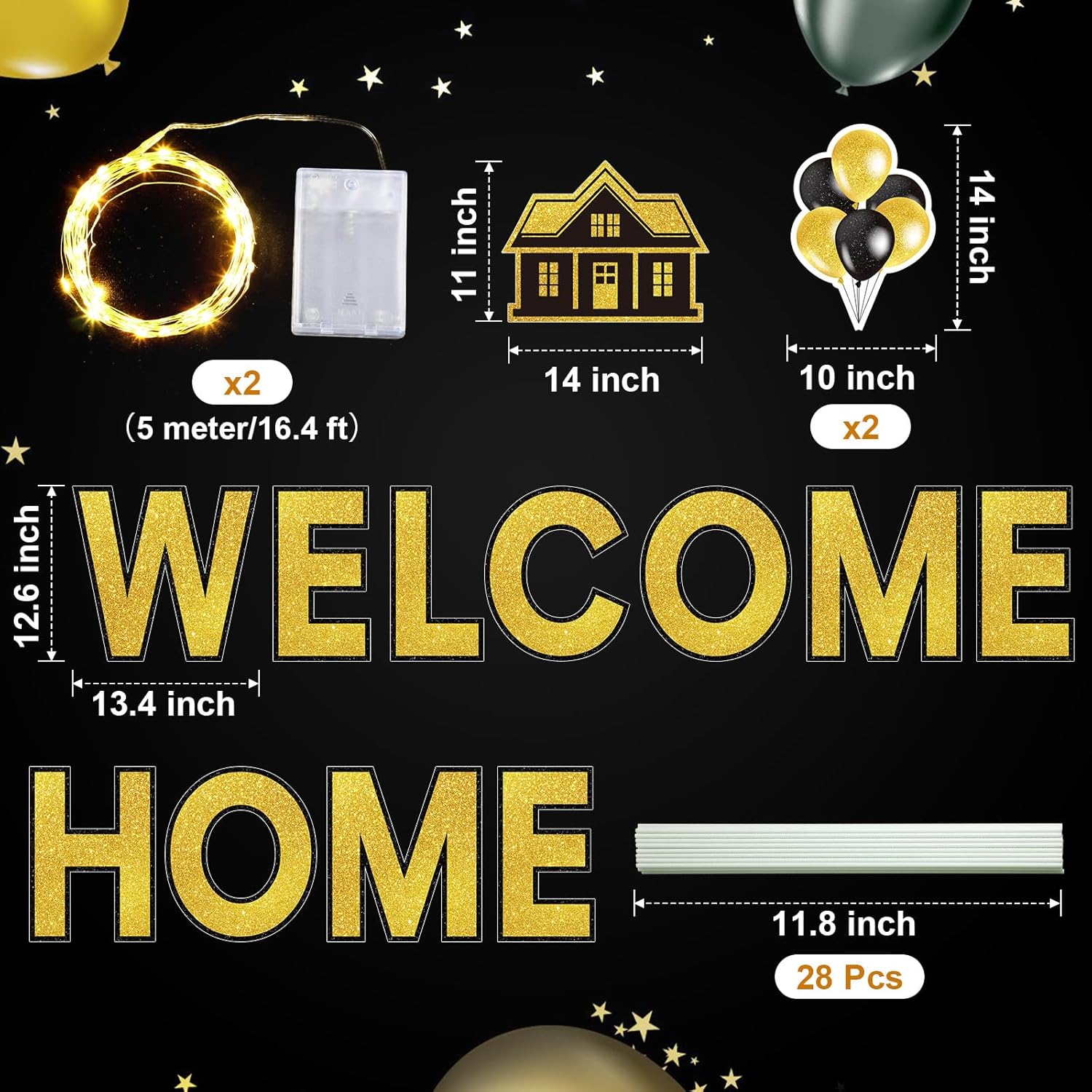 | Included Components | 14 x 'WELCOME HOME' lawn signs, 2 x 16.4 ft LED light strings, 28 x plastic stakes |
