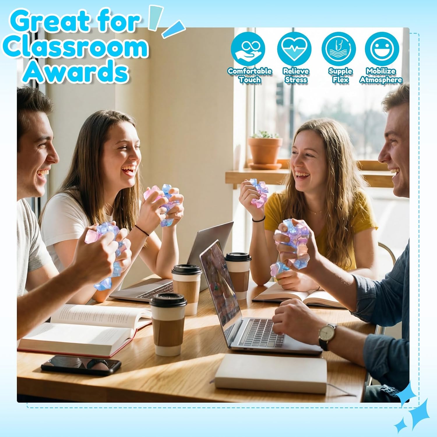 Features: Ice cube squeeze simulates the shape of ice cube, made of soft and elastic TPR material, and instantly rebounds when squeezed. When you are anxious or stressed in daily life, squeeze it, it is like freezing and crushing your worries, giving your fingertips a stress relieving feedback. Macaron colored ice cube stress balls can be played with when you are bored, applied as small desktop ornaments, and shared with friends in different colors. It is relaxing and fun. Specifications: Material: TPR Color: orange, pink, purple, blue Size: 0.78 x 0.78 inch/ 2 x 2 cm Package includes: 100 x Ice cube balls Notes: Manual measurement, please allow slight errors on size. The color may exist a slight difference due to different screen displays Our products have strong adhesive, please do not stick them on the paper cabinet, paint cabinet, in case of damage to the furniture