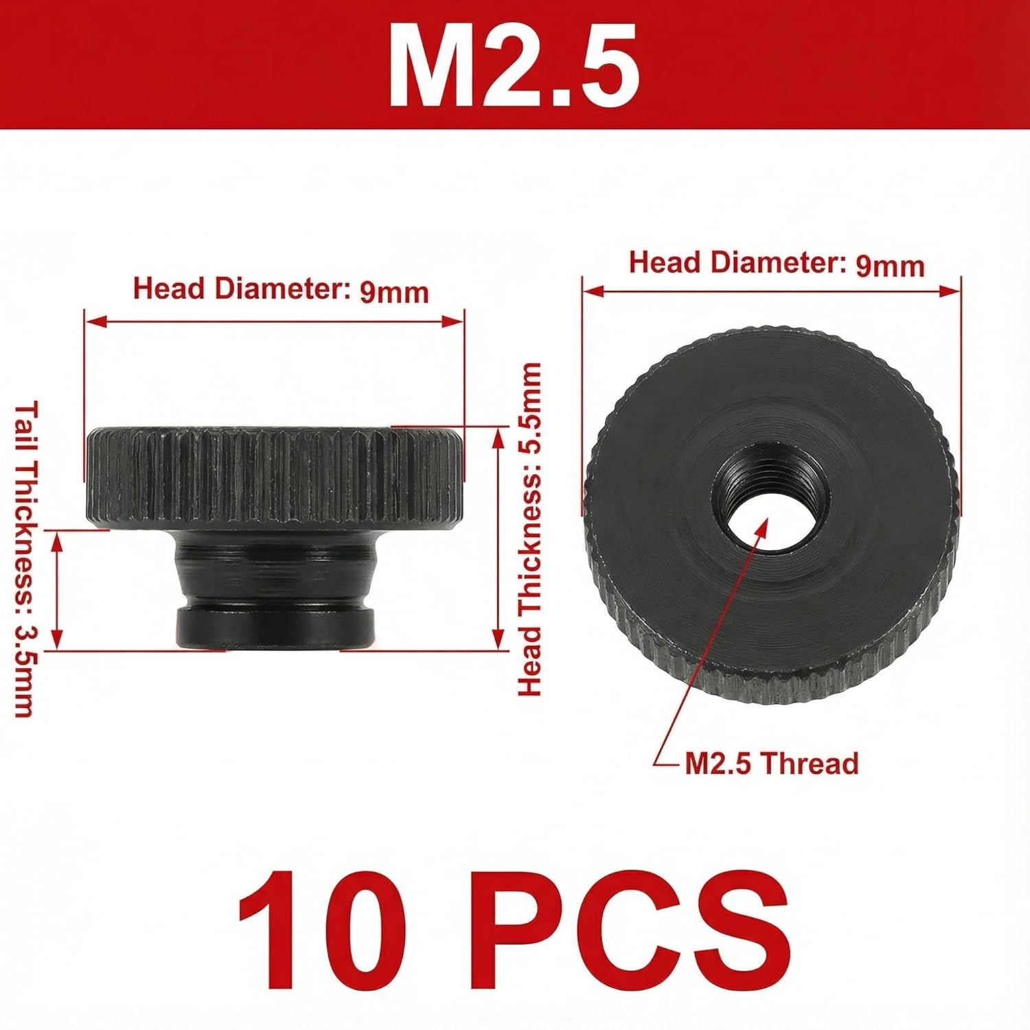 Specifications:Quantity: 10 piecesMaterial: Carbon steelFinish: Black zinc-platedThread diameter: M2.5Outer diameter: 9 mmTotal height: 5.5 mmColor: BlackPackaging includes: 10pcs M2.5 Knurled Thumb Nuts