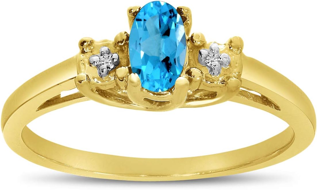 This 14k yellow gold oval blue topaz and diamond ring features a 5x3 mm genuine natural blue topaz with a 0.19 ct total weight.