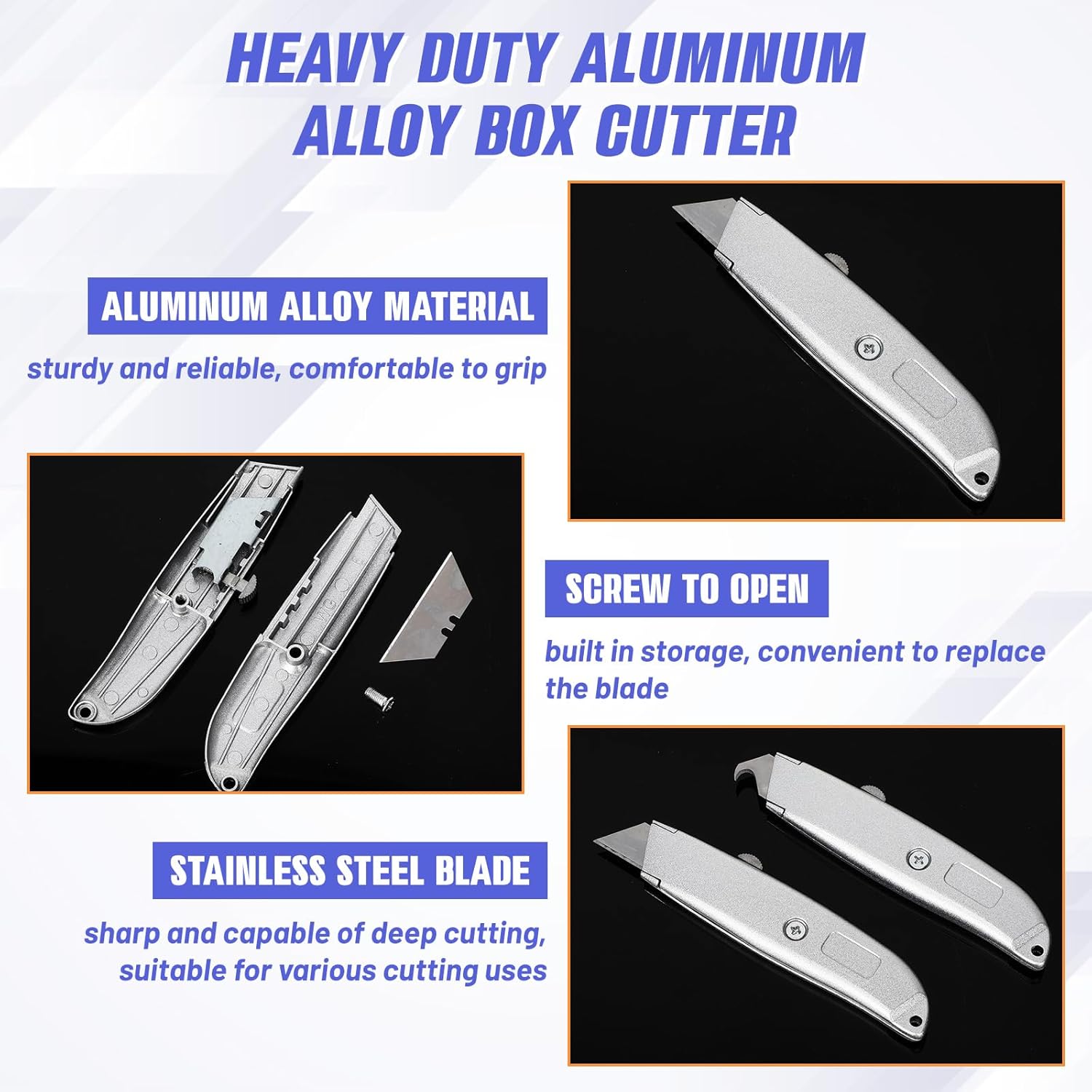 Features: Optimal size for precision and comfort: With dimensions of about 5.83 x 1.38 inches/ 14.8 x 3.5 cm, this heavy duty utility knife offers an ideal balance between size and functionality. Its compact design ensures cutting, enabling efficient handling of tasks with accuracy and ease. Safety and maintenance advisory: While utilizing the utility knife, adhere to safety protocols by keeping the blade stored when not in use and wearing appropriate protective gear. Regularly inspect and maintain the tool to prolong its life and ensure optimal performance in all cutting tasks. Material: aluminum alloy Color: silver Size: about 5.83 x 1.38 inches/ 14.8 x 3.5 cm Package includes: 20 x Heavy duty utility knives 40 x Retractable blades Notes: Manual measurement, please allow slight errors on size. The color may exist a slight difference due to different screen displays Pointed items are included, please be careful when using and please keep them away from kids