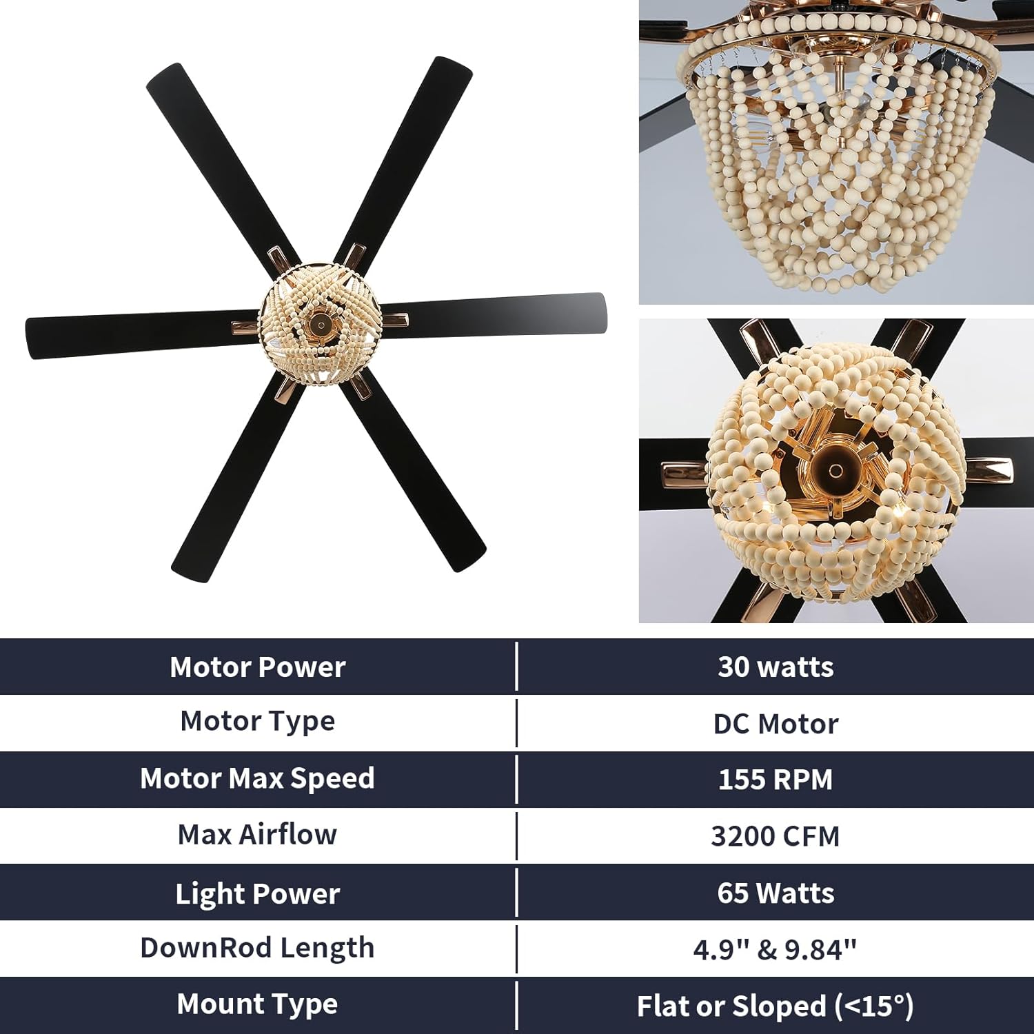 | Special Features | Adjustable Height, Can be installed on a ceiling tilted at 15°, Ceiling fan with light, Dual style fan blades, Wooden bead shades |