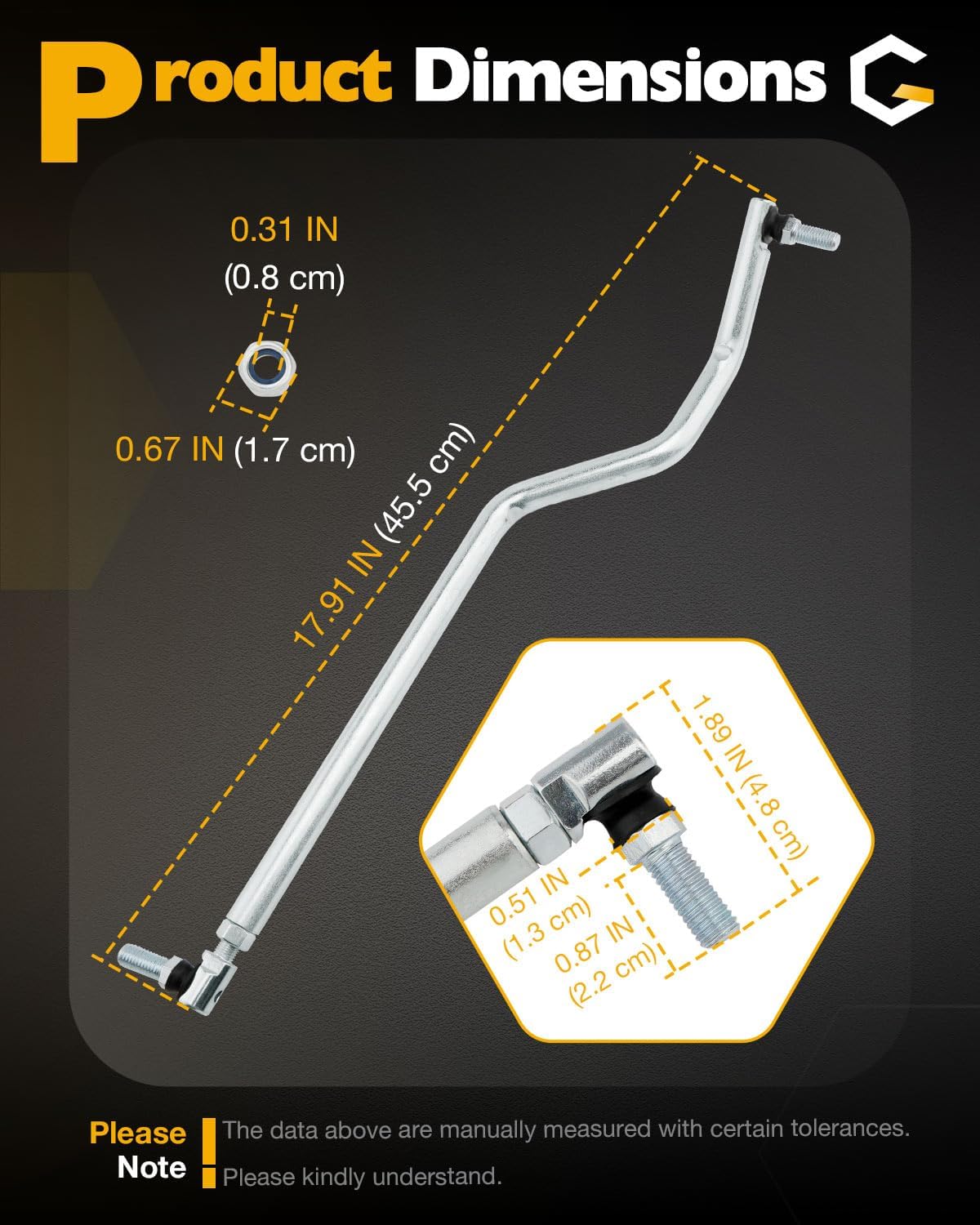 Packing List:1 x LH Adjustable Steering End Drag Link1 x RH Adjustable Steering End Drag LinkCondition: NewCompatible with:John DeereD100 G110 L100 L105 L107 L108 L110 L111 L118 L120 L130ScottsL1742 L17.542 L2048 L2548Sabre14.542GS 1642HS 1742HS 17.542HPrecise Fit Part Numbers:Left Side: GY20491, GY20439, 14M7400, 245-402Right Side: GY20492, GY20440, 14M7400, 245-401Function: With the passage of time, the steering arm parts will gradually be worn and even broken. At this time, the lawnmower / yard tractor will not be able to be used normally, and will have an impact on safety. It is recommended that you replace draglink kit in time. Replacing a new improved steering drag links bar can provide you with long-term stability and excellent performance. This adjustable drag link set meets even exceeds the oem standard, and has been well-tested in the factory, perfectly matching the original one, and can be installed directly. If you are confused about the installation, we suggest you can watch YouTube and will find a great instruction. Of course, considering the safety of use, it's best to let a professional technician install it if possible.We are a factory direct saler. Customers can spend a small amount of money and get high quality brand new control arm. This car door cable repair kit provides excellent value at the cheapest price.Own it now.