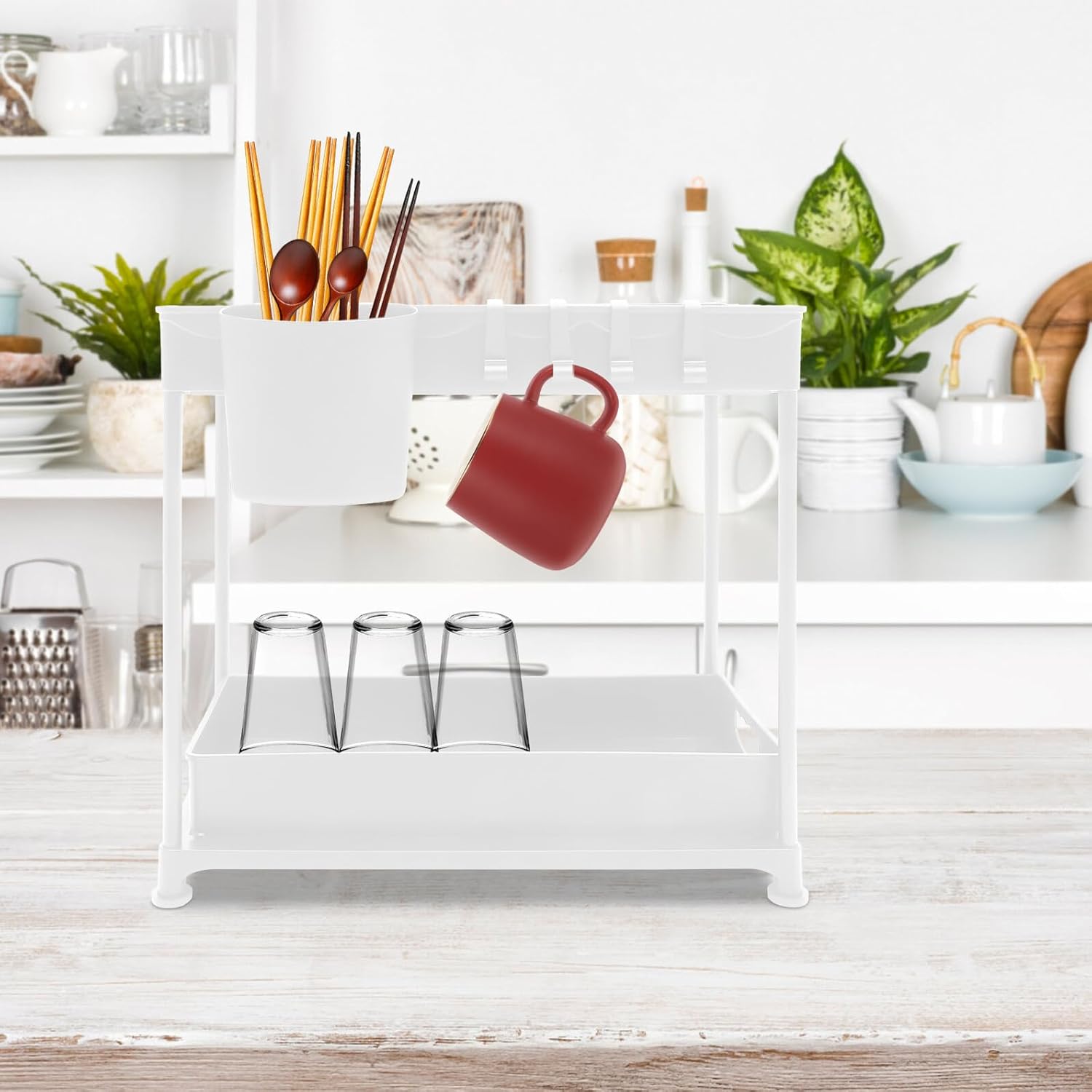Package Include 1 x set of kitchen organizer Characteristics - Size: 40.00X36.00X23.00cm/15.72X14.15X9.04in -Material:PP -Product Info:Pull the rack - Color: White - This kitchen storage rack uses a guardrail design to prevent tableware from accidentally falling, use with confidence under the sink organizer kitchen. - It is designed to be pulled out basket, which is more convenient to use than other normal storage organizers kitchen sink organiser. - PP material, strong and . Large load-bearing capacity, this kitchen storage rack can hold heavy items. - Layered design of this 2 tier kitchen storage rack brings the larger capacity, the material makes it strong and . - Hollow design, good ventilation and drainage. Suitable for kitchen, bathroom, laundry room and other places. under the sink organiserGoods Informationunder kitchen sink storage organiser Do you want to have a kitchen storage rack to store your seasoning bottles and other items? Then, our storage rack is carefully prepared for you.under kitchen sink organizer This kitchen storage rack is a good helper for kitchen.under sink rack Enough capacity to store many seasoning bottles and kitchen supplies