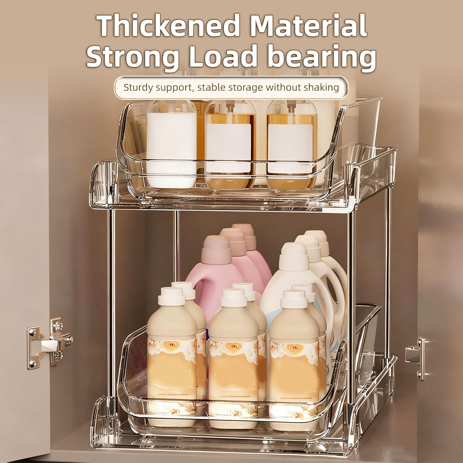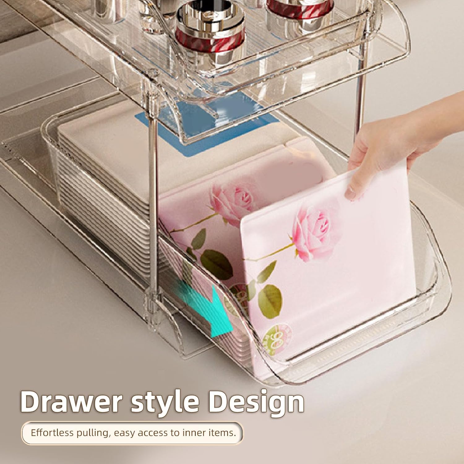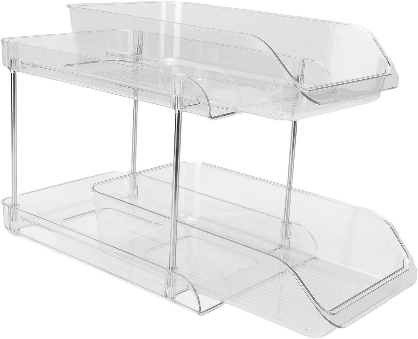 1. Multi Use Storage: The multi functional slide out drawer organizer is incredibly versatile, designed to help you better organize spaces in the bathroom, bedroom, kitchen, closet, under the sink, pantry, and on shelves. It can be effectively used to store and categorize a wide array of items including snacks, food, beverages, toiletries, and skincare products. 2. Premium Material: The storage organizer is constructed from premium PET material that is built to last. Each tier is securely connected by thickened stainless steel support tubes, ensuring overall structural stability and strength. 3. Easy Access: Featuring transparent acrylic drawers, which allow you to clearly see the contents inside, enabling you to quickly locate the items you need. It is an essential assistant for organizing under cabinet storage, managing kitchen clutter, and serving as an efficient under sink organizer. 4. Easy Setup: Requiring no tools for assembly, the setup is completely effortless! Thanks to its intuitive snap together design and sliding shelves, our under sink storage unit can be easily assembled in just a few minutes. The anti slip rubber feet on the bottom ensure exceptional stability. 5. Space Efficient: It allows for stratified organization of various categories of items. Once installed, it does not occupy excessive additional space, seamlessly integrating into kitchens, bathrooms, or any other area requiring storage solutions. Specification: Item Type: Under Sink Organizer Material: PET Weight: Approx. 1111g / 39.2oz Product Size: Approx. 30x25x19cm / 11.8x9.8x7.5in Shelf Height Spacing: 17cm / 6.7in Storage Basket Size: Approx. 30x16.5x7cm / 11.8x6.5x2.8in PackageList: 2 x Storage Basket 2 x Tray 4 x Stainless Steel Tube 10 x Rubber Foot
