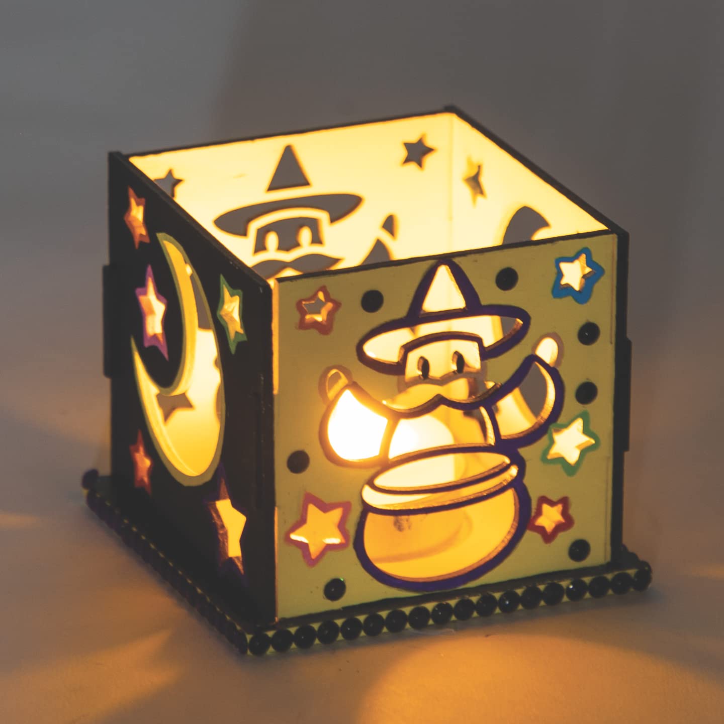 Wizard wooden tealight holders. Perfect for children as these wooden models simply slot together. Decorate using our Deco pens, acrylic paints, glitter and stick-ons decorations (not included). Size 9cm x 9cm x 8cm
