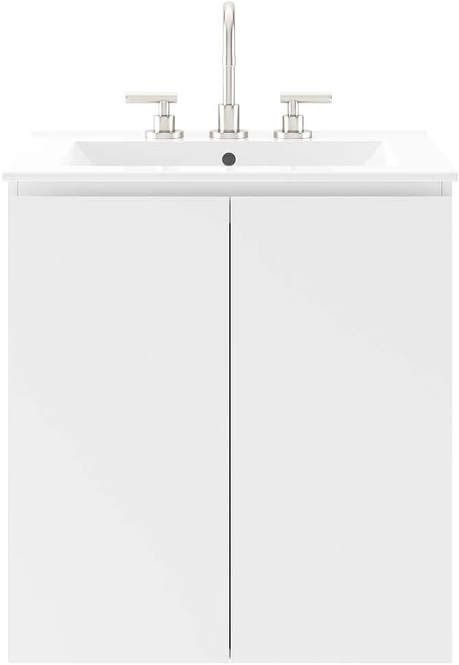 The Bryn 24" Wall-Mount Bathroom Vanity boasts a sleek, modern design with a clean-lined silhouette. Crafted durably with particleboard and melamine, it mounts directly to the wall, offering ample storage behind two soft-close doors. Featuring a cut-out design for plumbing, this vanity comes with a ceramic sink basin, 8-inch centerset holes, and an integrated countertop. Fixtures are not included, and assembly is required.