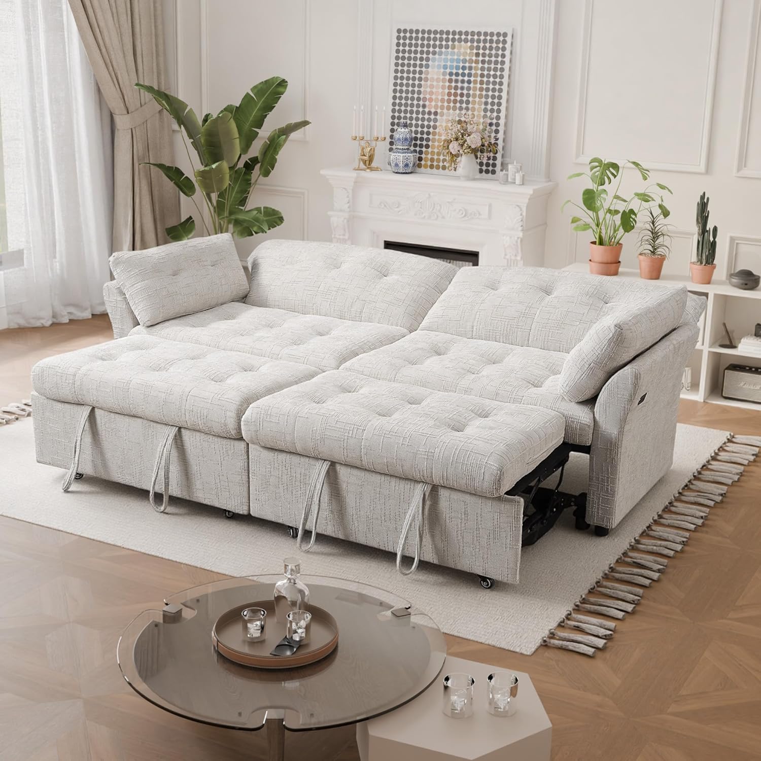 The Casaphoria 3-in-1 Convertible Sofa Bed redefines versatile living seamlessly transitioning from a comfortable 3-seater couch to a spacious L-shaped sleeper and a relaxing lounger. Featuring an innovative dual pull-out bed system it effortlessly accommodates overnight guests providing a full sleeping solution without sacrificing daily style. Its smart design includes smooth-rolling wheels for easy repositioning and a built-in USB port adding modern convenience to your living room bedroom or apartment.Crafted for superior comfort this sofa bed boasts plush high-resilience foam cushions and a sturdy frame ensuring lasting support whether you're sitting upright or fully reclined. The adjustable backrest flattens to 180° allowing flexible lounging positions—perfect for reading napping or stretching out. With no tools required for setup it’s ready to use in minutes.Ideal for small spaces and modern homes its space-saving 89.8-inch design is available in three calming colors (Beige Blue Green) to complement your decor. Experience the perfect blend of function comfort and style with Casaphoria—your ultimate solution for flexible seating and sleeping.