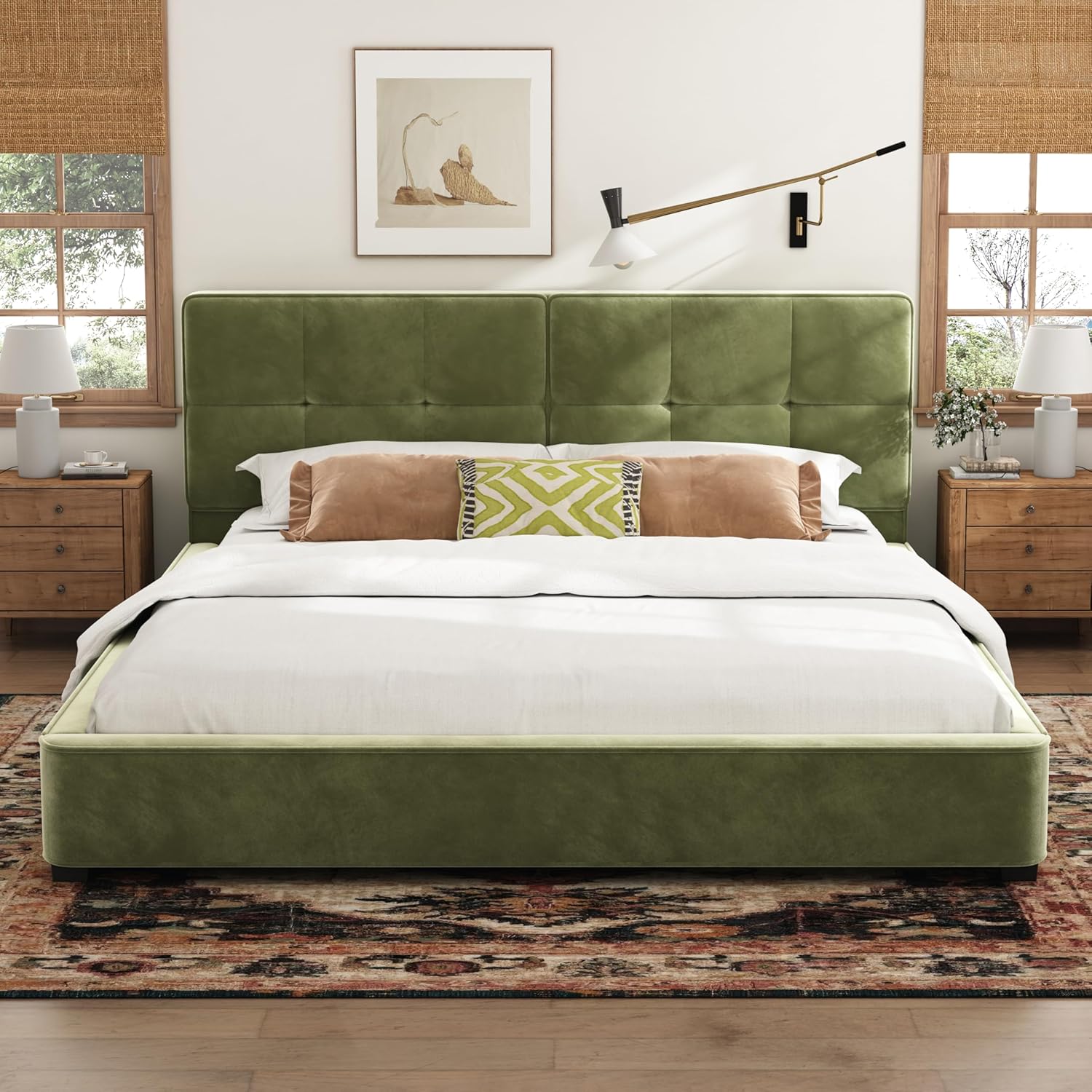 | Item Type Name | King Size Bed, Velvet Upholstered Platform Bed, Wooden Slats Panel Support, Tufted Square Corners Haedboard, No Box Spring Needed, Easy Assembly |