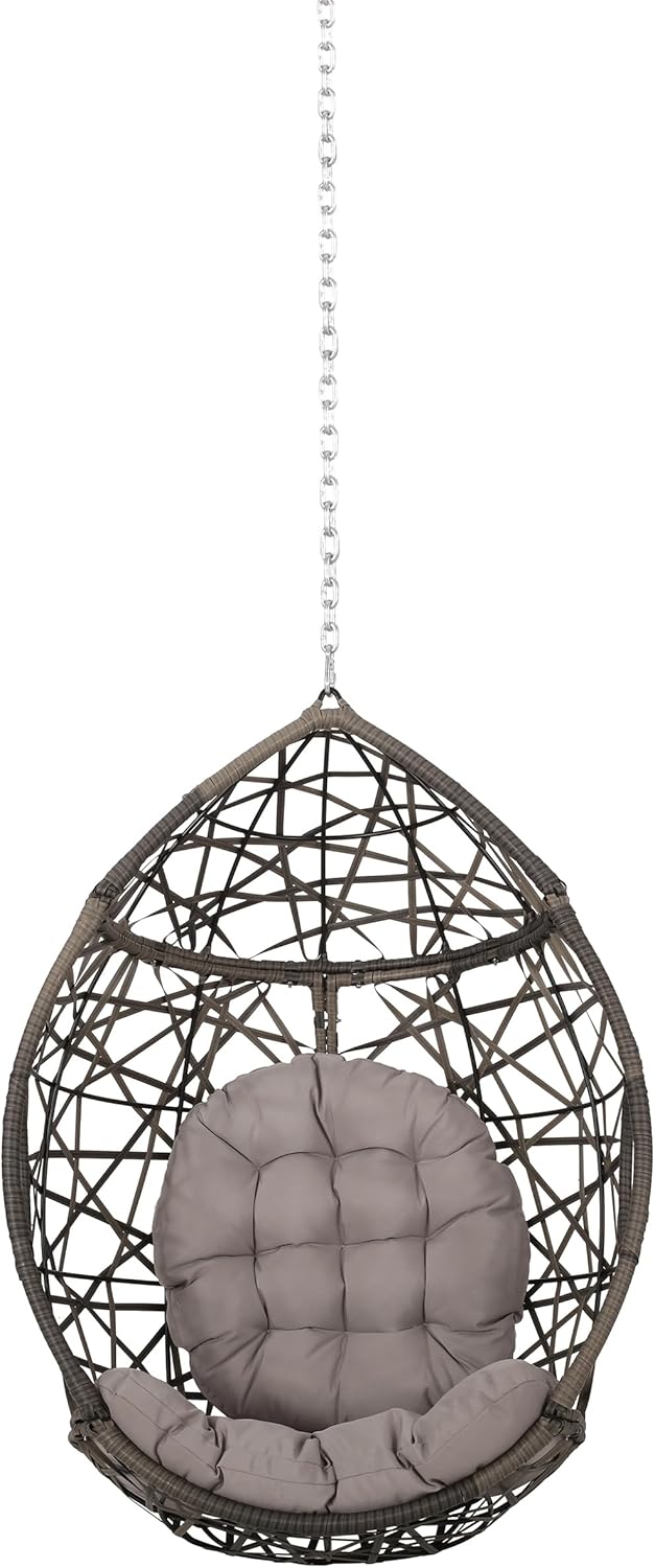 Take a little time to yourself and enjoy the smooth swaying motions of our hanging chair. Featuring a stunning teardrop shape, this charming accessory not only gives your space a refreshing transitional look but also offers incredible comfort. This is constructed with beautifully wrapped wicker weave and a sturdy metal frame, allowing you hours of much-needed leisure whenever you need it. Finished with plush water-resistant cushions, this piece can be used both indoor and outdoor, making this a truly extraordinary addition to your lounge area.Not Included: Hanging Stand, Mounting HardwareMaterial: Faux RattanFrame Material: IronCushion Material: Water-Resistant FabricMultiple Color OptionsAssembly RequiredDimensions: 28.50 inches deep x 36.50 inches wide x 52.00 inches highSeat Cushion Thickness: 6.00 inchesWeight Capacity: 400 lbs