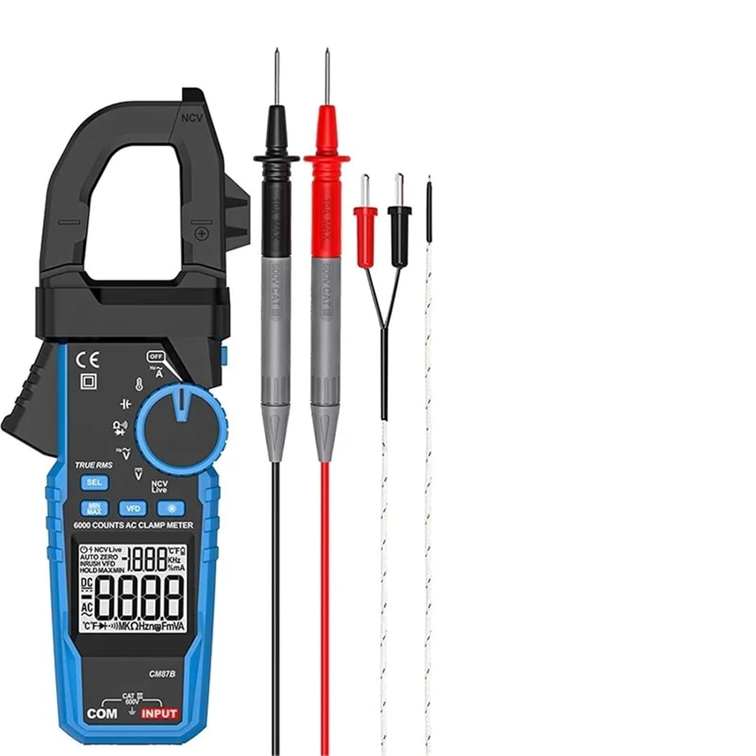 Clamp MetersCM87Pro AC/DC 1000A Clamp Meter 1000V True RMS Digital Clamp Meter Amperimetrica Capacitance Temperature Ohm Hz Tester==========Weight : 0.48kgDimensions : 24*11*5Operating Temperature : 0-50 Measuring Inductance Range : clamp meterDisplay Type : Digital OnlyModel Number : CM87 ProDIY Supplies : ElectricalCertification : ,FCC,DC current : 0-1000AAC current : 0-1000AK type temperature probe : haveDC voltage : 0-1000VAC voltage : 0-750VCapacitance : 0-60mFResistance : 0-60Msupport Inrush current : 0-1000ADisplay counts : 5999Jaw opening : 42mmLow battery indication : when less than 2.4VBattery : 2*1.5V AAA