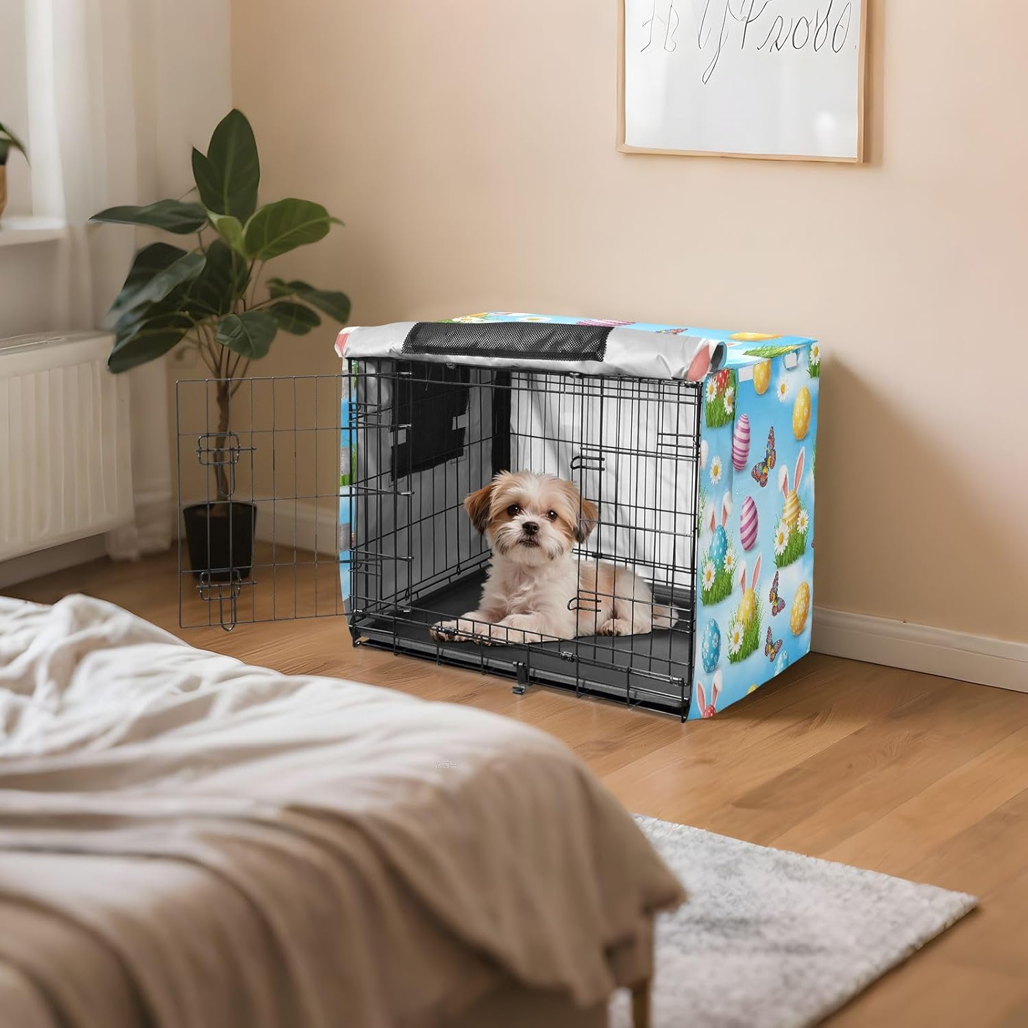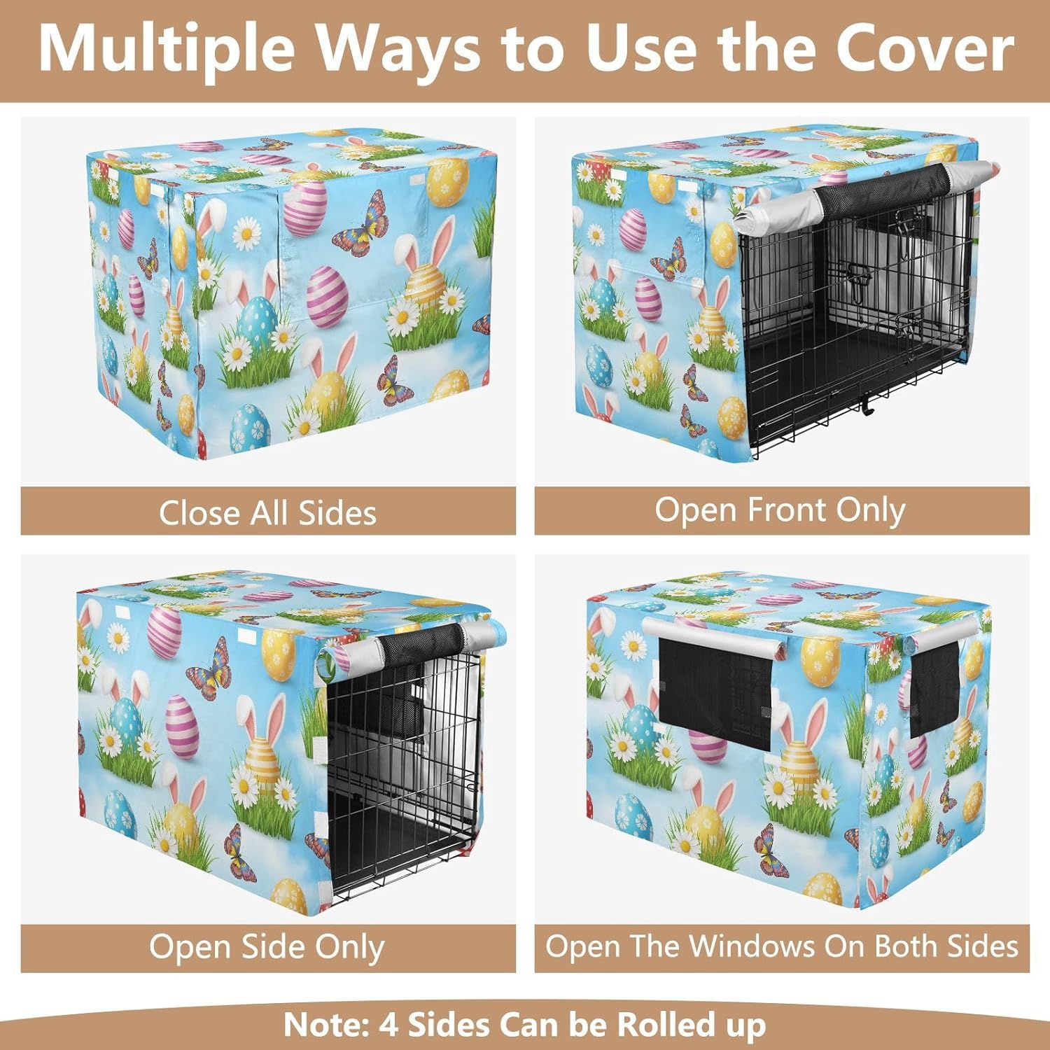 Weather-Resistant Dog Crate Cover is made of 600D silver-coated oxford fabric that provides exceptional protection against wind, rain, and sunlight. This material prevents your pet from scratching the crate and blocks most direct sunlight, ensuring a safe and comfortable space.Simple and Secure Setup features an easy fastening system, making it effortless to install without the need for tools. This pet kennel cover fits securely onto your dog crate, ensuring it stays in place and provides protection at all times.Ventilation for Comfort with mesh windows on all sides, our dog crate cover ensures optimal airflow, keeping your pet cool and comfortable even during long periods inside the crate. The mesh design also provides privacy and security for your pet.Wind-Resistant and Stable with four adjustable tie-down straps at the bottom, this indoor dog crate cover stays securely in place, preventing it from being blown away by the wind or removed unintentionally. This feature ensures that your pet’s crate remains stable and protected.Versatile Use Ideal for both indoor and outdoor settings, this dog kennel cover provides the protection your pet needs in various environments, whether at home or on the go. The compact design makes it easy to store and travel with.