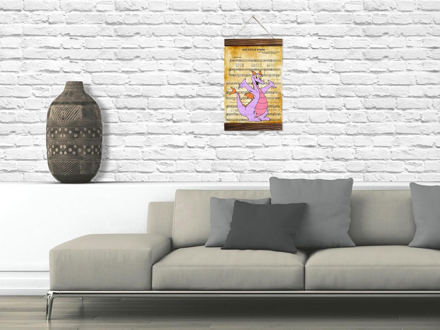 AUTHENTIC DISNEY EPCOT FIGMENT ARTWORK Bring the magic of Disney's Figment and the beloved "One Little Spark" song to life with this vibrant sheet music art print. This authentic Disney character artwork celebrates Figment, the lovable purple dragon from the EPCOT pavilion, combined with the inspiring sheet music of the iconic "One Little Spark" composition. Figment represents imagination, wonder, and inspiration - the perfect embodiment of Disney magic for collectors and fans alike. PREMIUM CRAFTSMANSHIP AND QUALITY MATERIALS This framed canvas art print is professionally crafted using premium-grade 100% cotton fine art canvas with Pigment-based archival inks that resist fading. The wood frame is hand-assembled from high-quality hardwood, finished with water-based stain for a natural, rich appearance. The canvas is stretched and mounted securely, ready for immediate display. Every element of this print is designed for durability and visual impact. READY TO HANG - DISPLAY WITH CONFIDENCE This canvas print comes complete with secure jute twine hanging hardware, allowing for quick and easy installation on any wall. The frame design (11.8" x 15.7") makes it perfect for living rooms, bedrooms, home offices, and entertainment spaces. The generous display size ensures commanding visual presence without overwhelming your space, making it an ideal statement piece for any room. PERFECT GIFT FOR DISNEY FANS AND DREAMERS This Figment art print is the ideal gift for Disney enthusiasts, EPCOT lovers, theme park collectors, and anyone who appreciates imaginative, inspirational decor. Whether for birthdays, anniversaries, house warmings, or any special occasion, this Disney-inspired merchandise celebrates the spirit of creativity and wonder. Fans of Disney's Imagination pavilion and the "One Little Spark" philosophy will treasure this piece. AUTHENTIC SHEET MUSIC AND DISNEY MEMORABILIA The sheet music element of this print adds a unique, sophisticated layer to the design, honoring the cultural and emotional significance of Disney's iconic theme park composition. "One Little Spark" represents the spark of imagination within all of us - a powerful message for creating inspiring home environments. This print serves as both functional wall art and a daily reminder to embrace creativity and possibility. IMPORTANT INFORMATION Dimensions: 11.8" x 15.7" (30cm x 40cm). Due to natural wood variations and the handcrafted printing process, minor color variations may occur. Monitor brightness can affect color perception. All artwork is produced on-demand to ensure quality.
