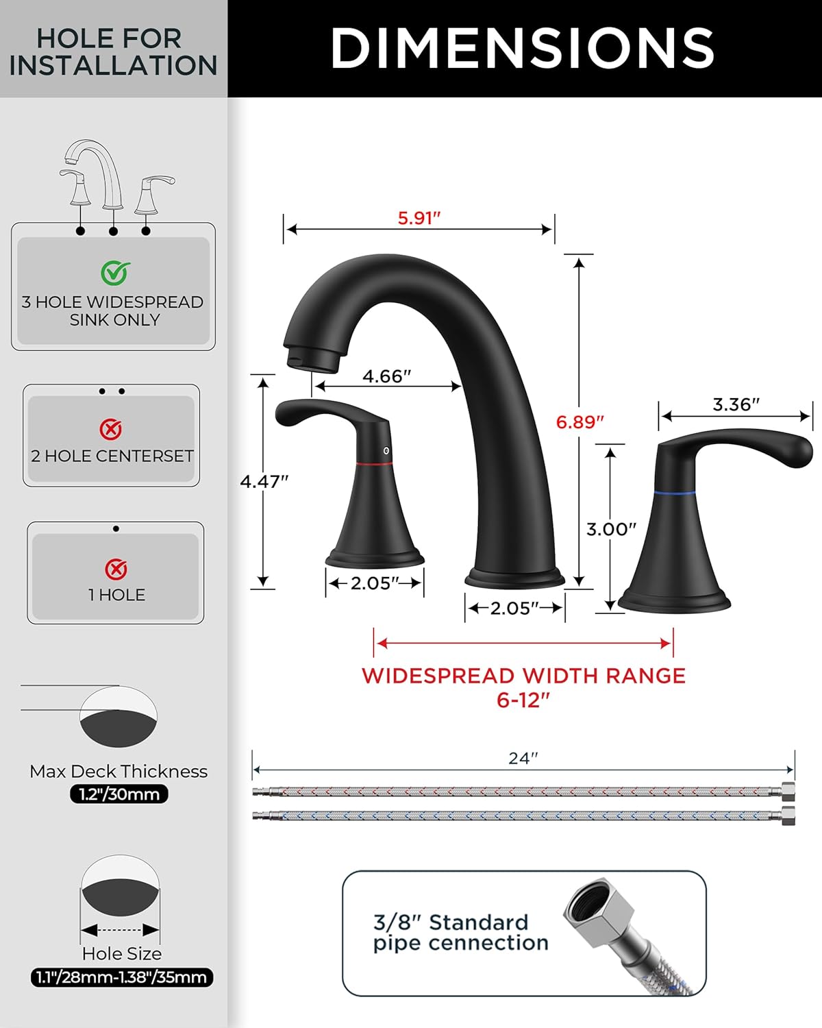 | Included Components | 1.2GPM Spare Aerator, 3 Pieces Bathroom Faucet, Installation Hardware, Instruction Manual, Metal Pop-up Drain |