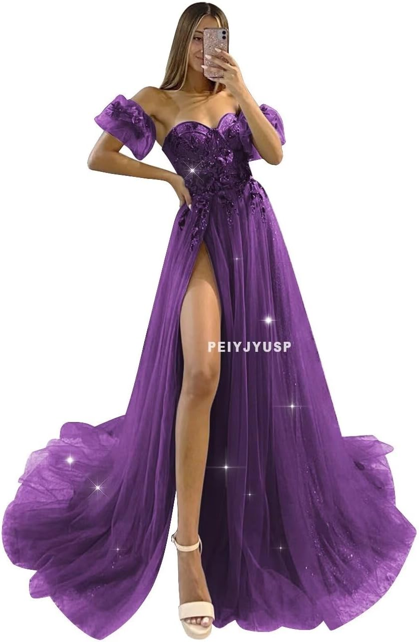 | Fabric Type | Long slit lace appliques prom dresses for teens dusty purple off the shoulder glitter tulle prom dress wedding evening party gown |
