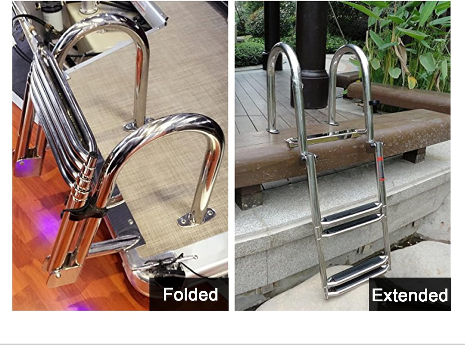 Product DescriptionHeavy-duty stainless steel construction means your ladder will have a long service life free of dents, cracks, or corrosion and a powerful 440 lb. weight capacity. Considerate design, superior quality, and our good name make sure you'll enjoy this handy boat ladder for years to come.Specifications:- Material: Stainless Steel- Size: Deployed Height: 45.67" (116cm), Stowed Height: 16.1" (41cm), Wide: 15.94" (40.5cm).- Load: 200 kg/440 lbsFeatures:- Made of durable 304 stainless steel.- Comfortable large handrails for easy boarding boat.- Safety extra wide comfort non-slip steps.- Steps telescope ladder easy to close.- Flips up for easy storage.- Max weight capacity: 440 lbs.- Easily mounts to boat deck pool dock, bow or rear etc.How To Mount:1. Choose the most suitable side of your transom platform for mounting the ladder.2. When mounting, locate a place where the ladder will not interfere with the turning of the motor or be near the propeller of your craft.3. Mount the ladder in place by holding bracket up to platform and inserting mounting screws.Safety Guildlines:- No jumping or diving!- Do not use when motor is running!- Only one person on ladder at a time!- Check all steps and hardware before using!See more