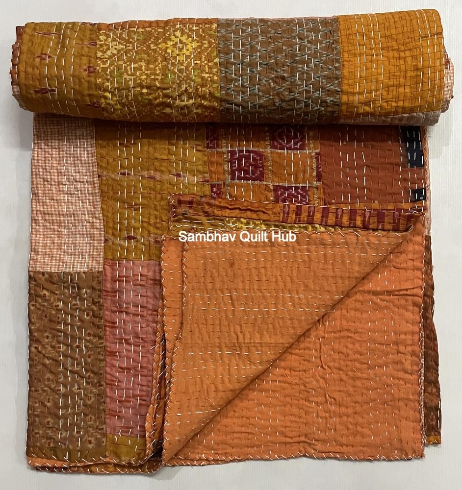 This is a special hand quilted Kantha Old Patola Sari. This work is done in countryside that provides work and livelihood for women in COUNTRYSIDE.The entire quilt is painstakingly embroidered with thousands of small and delicate kantha stitches to create a one of a kind masterpiece! It is made from vintage old silk saris, and softly quilted . It is embroidered by artisans in countryside. Kantha is the ancient Indian art of embroidery, actually the kantha is a simple running stitch. The way in which the stitch has been used is what makes the quilt extraordinary. While making the PIECES, the cloth is given layers that are kept together by the stitches. It is made is such a way that it is REVERSIBLE, can be used from both sides. As this is made from vintage sarees, it has some imperfections. They have patches of other color clothes. they might have some stains, although we wash them well before shipping to remove bad odor and spots. All these imperfections make these vintage art pieces more unique, charming & perfect piece for your home. We hope u would love this art. It is made from vintage old cotton saris, and softly quilted . It is embroidered by artisans in countryside.